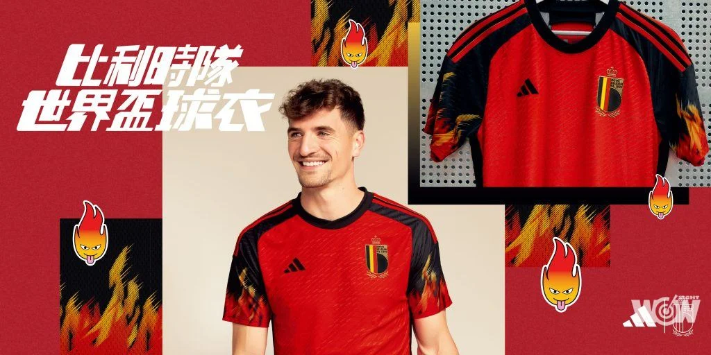 比利時有著「歐洲紅魔」的美譽,在歐洲足壇屢創出色戰績,目前更是世界排名第二的強隊。此次主場球衣大面積採用比利時象徵性的紅色,袖口則以黑色為底色,第一眼就能看見代表熱情與速度感的火焰圖案,驕傲地展示國家身份。