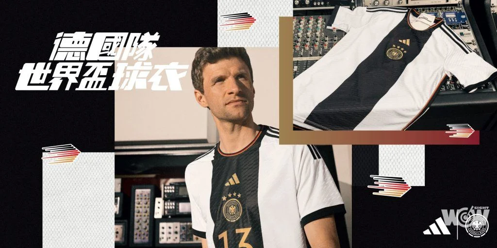 國家隊圖騰上的星星數,代表曾在世界盃奪冠的次數,曾於世界盃中四度奪冠的德國國家隊,在隊徽上方以四顆金星歌頌過往輝煌戰績。今年的主場球衣以德國標誌性的黑白配色為基礎,白底鋪上中央黑色線條,金色的球號及隊徽象徵足球的速度感,整體優雅而簡約。後頸處則印有德語的「DEUTSCHLAND」(德國)字樣,向國家致敬,宣告即將再創高峰!