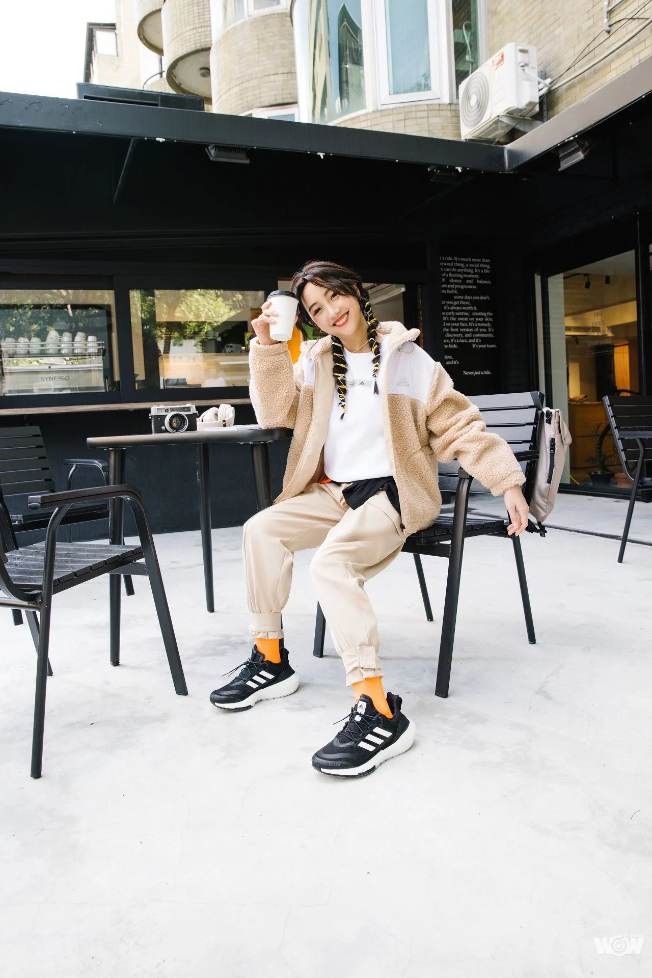 射擊甜心吳佳穎披上羊羔絨毛毛外套,肩部處拼接的白色平織面料具反光效果,立領設計也展現層次感。搭配奶茶色平織長褲,ONE TONE風格宛如泰迪熊般俏皮可愛!而內搭的主題大學T,胸前細長的反光LOGO為低調簡約的版型創造視覺焦點,是秋季舒適保暖的穿搭首選。