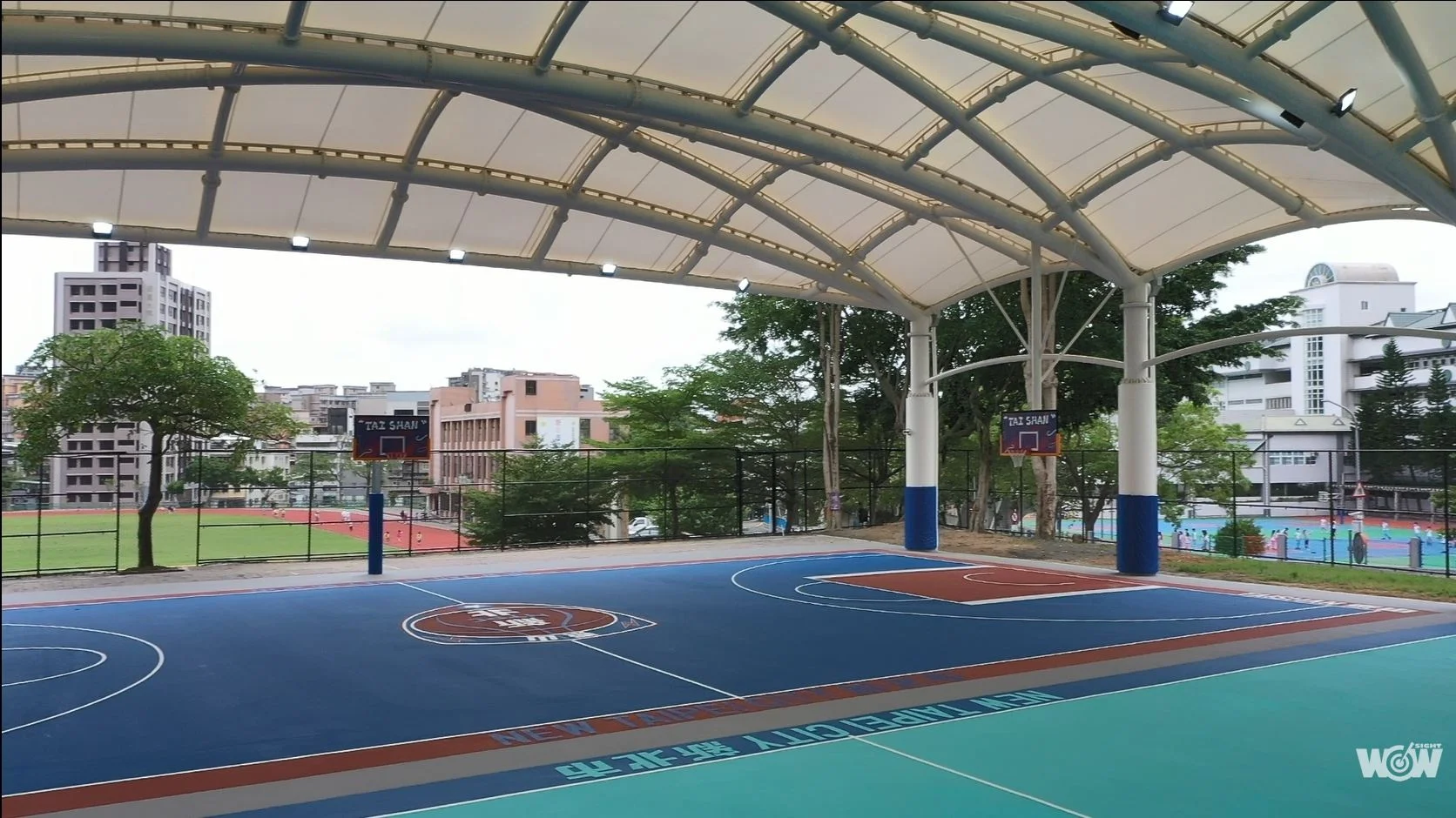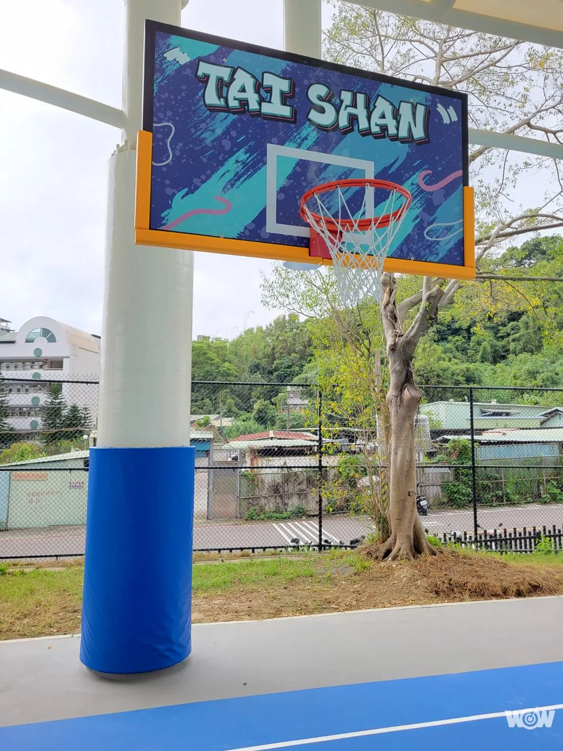 體育處表示,泰山體育園區戶外籃球場的天幕以鋼結構施作,能有效提升承載能力及耐震強度,天幕薄膜則是立體波浪造型,球場採用單向30M無落柱之大跨距設計,整體營造出開闊氣勢!球場以對比強烈的紅色與藍色為主色調,籃板是街頭塗鴉風非常吸睛,不只是打球、拍照打卡也很適合。球場上多處都有新北和泰山的文字及標誌,是非常在地的街頭球場。