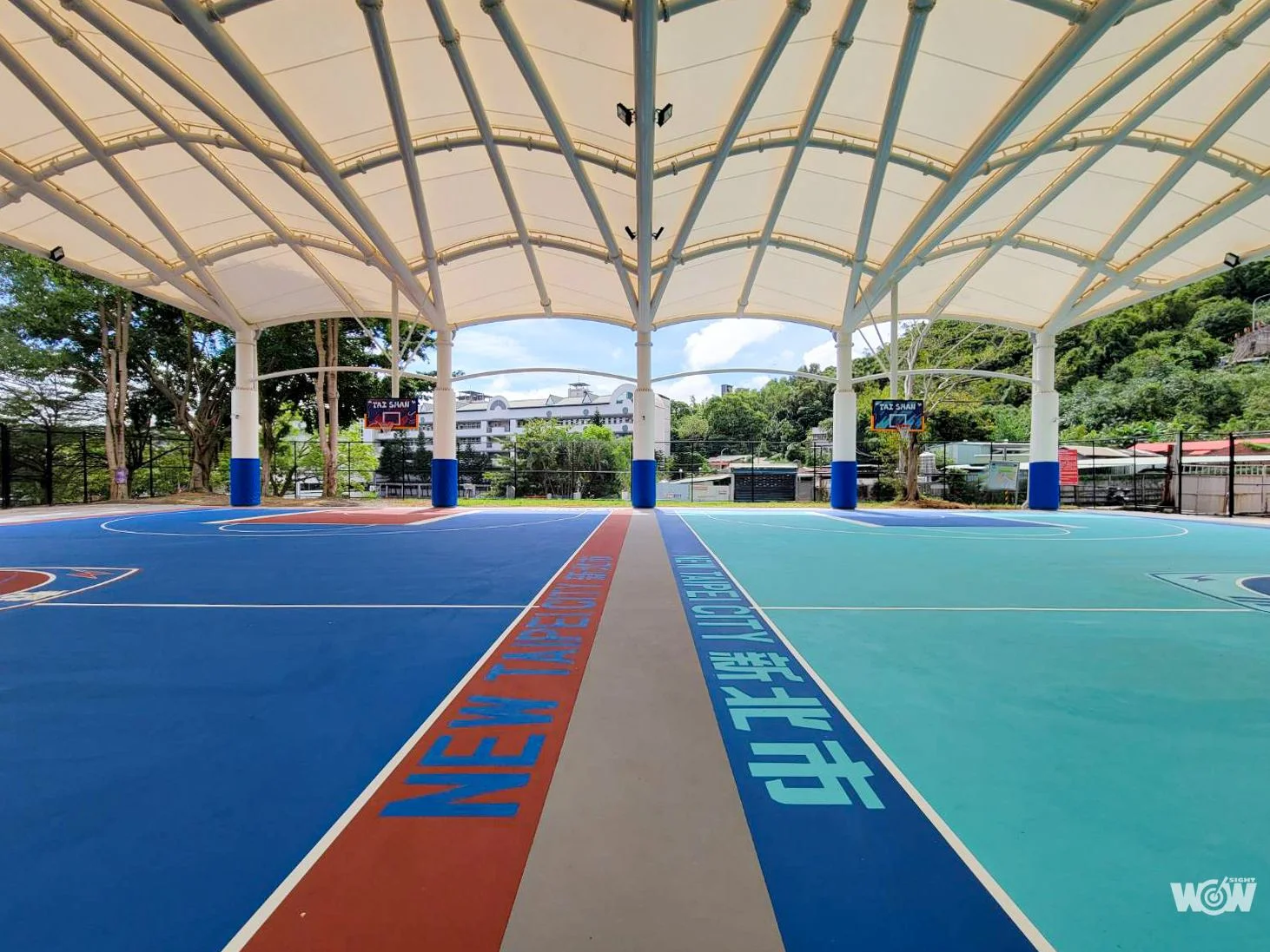 體育處表示,泰山體育園區戶外籃球場的天幕以鋼結構施作,能有效提升承載能力及耐震強度,天幕薄膜則是立體波浪造型,球場採用單向30M無落柱之大跨距設計,整體營造出開闊氣勢!球場以對比強烈的紅色與藍色為主色調,籃板是街頭塗鴉風非常吸睛,不只是打球、拍照打卡也很適合。球場上多處都有新北和泰山的文字及標誌,是非常在地的街頭球場。