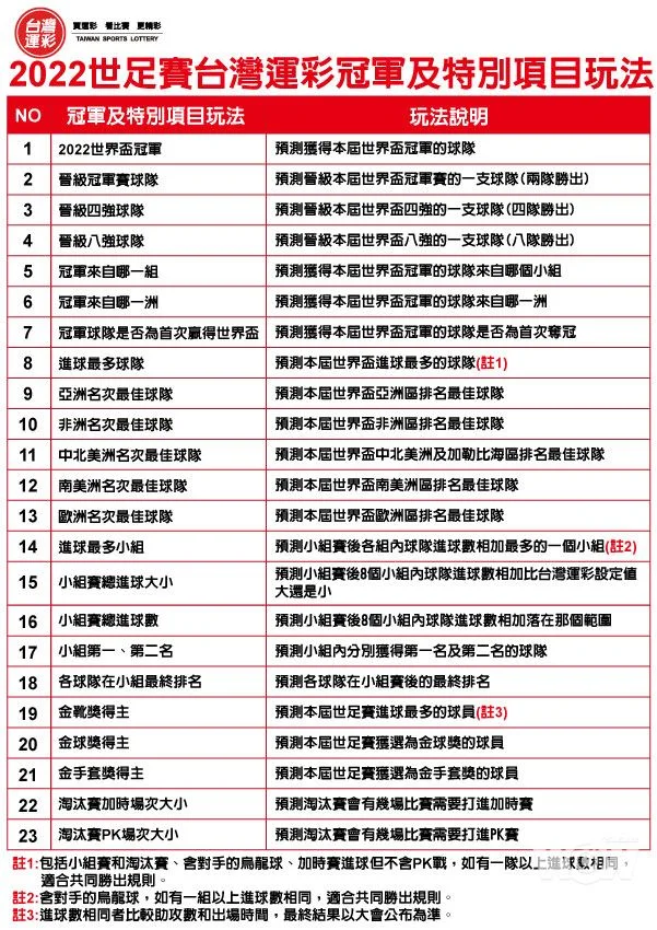 2022世足賽台灣運彩冠軍及特別玩法項目。(台灣運彩提供)