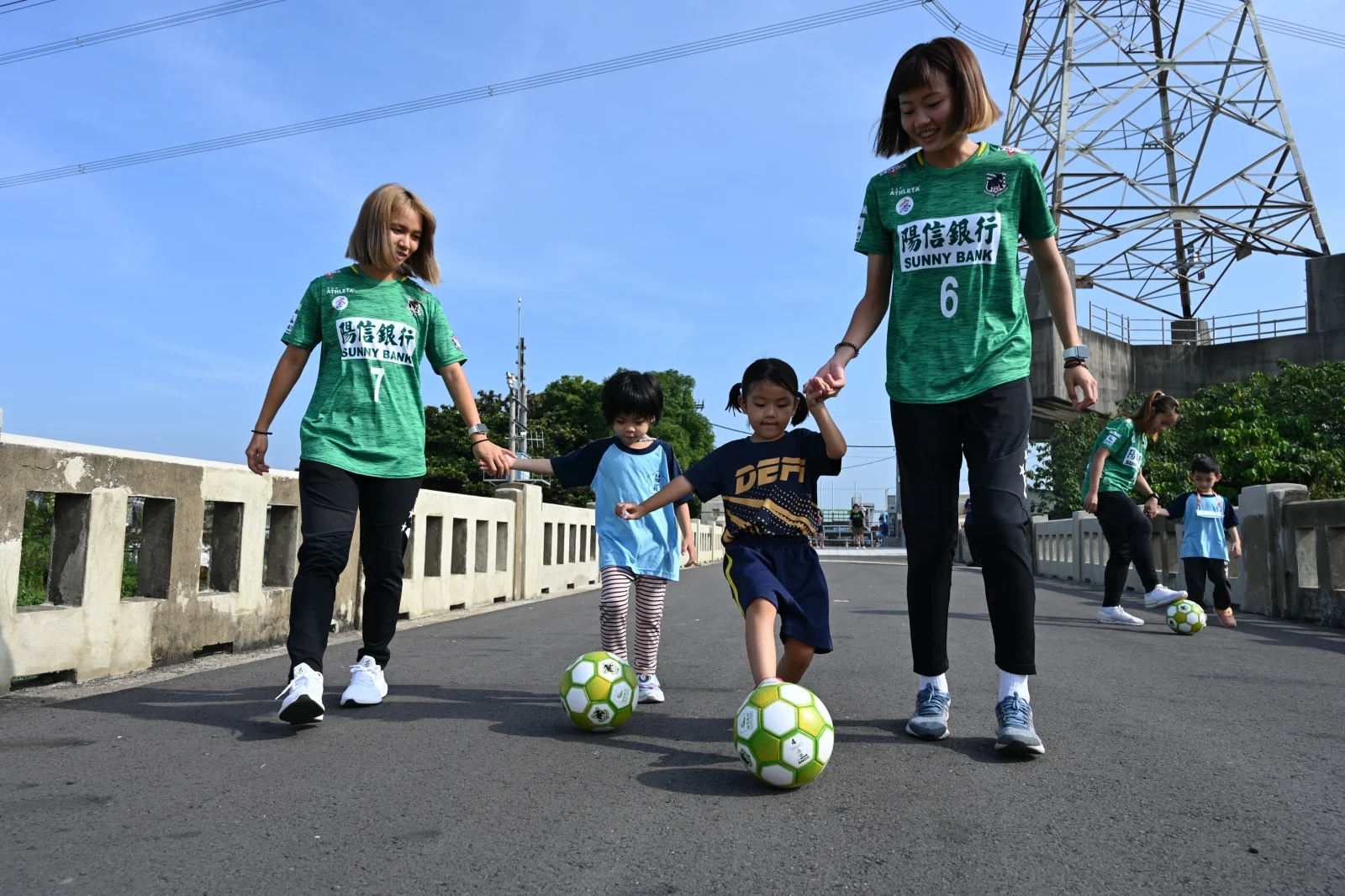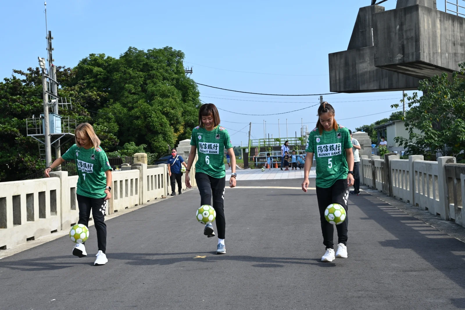 高雄陽信銀行女足隊梁凱柔、林月汝和周昕儀三名好手,前往山海圳國家綠道「大圳之路」曾文溪渡槽橋舊橋,指導善化茄拔國小的小朋友們踢球,小球員雖然腳上功夫生澀,但以如詩如畫的唯美的風景當背景,各個架式十足,最後也踢得有模有樣,體驗結束後玩到各個都「燒聲」,還大呼不滿足。