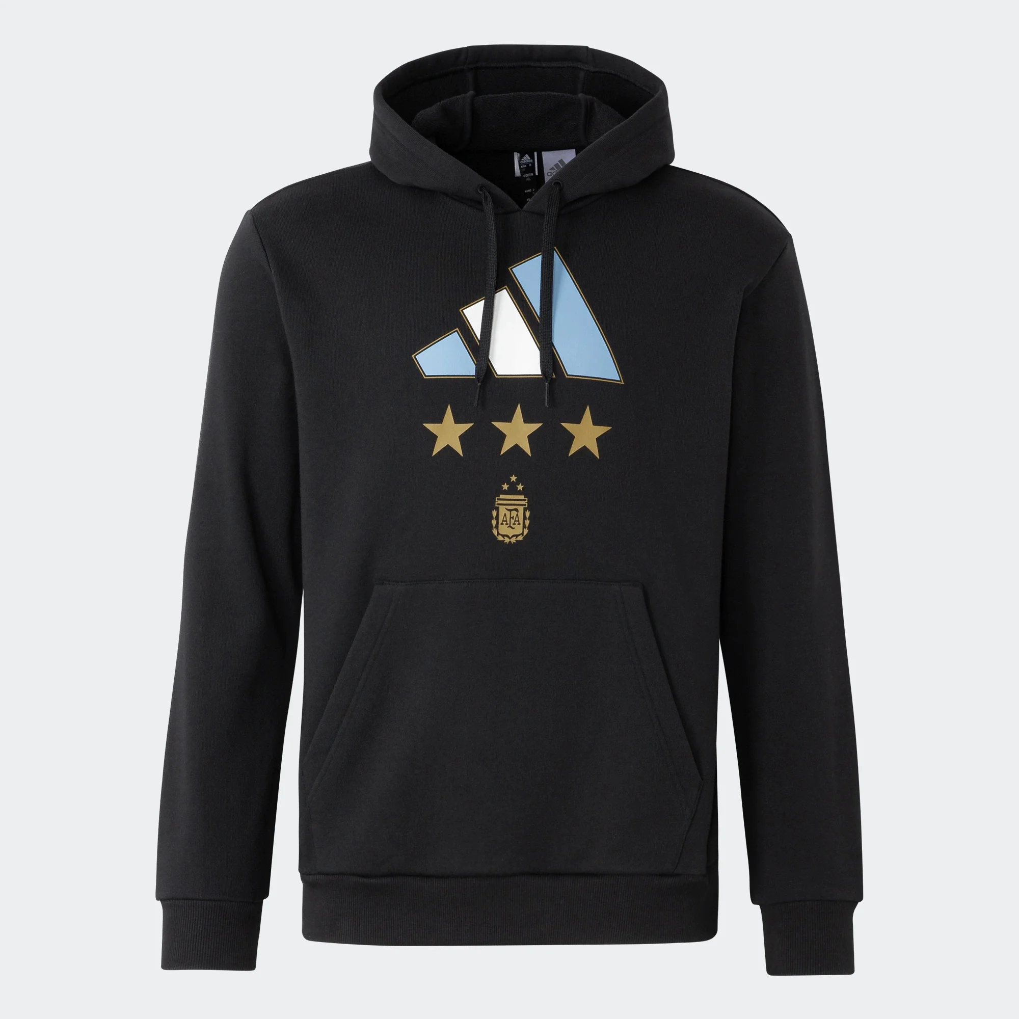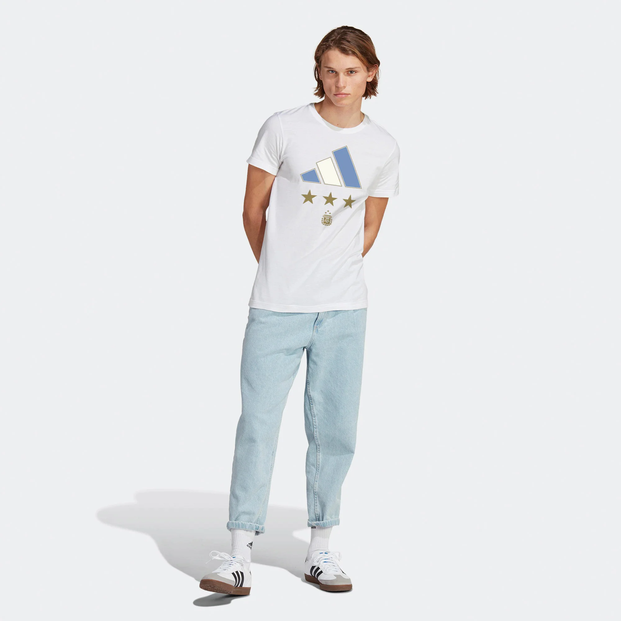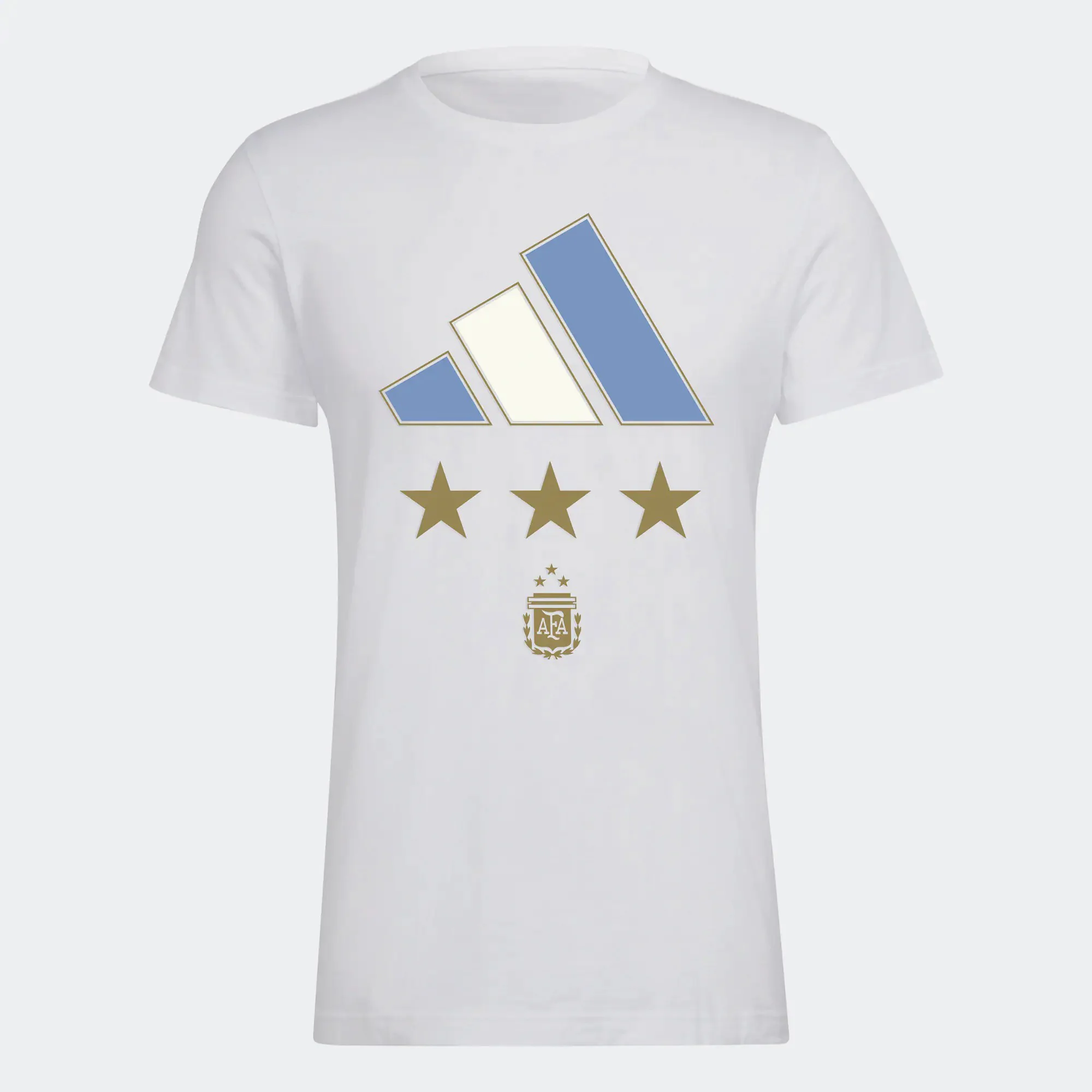 2022卡達世界盃最終以梅西(Lionel Messi) 率領的阿根廷隊奪冠,睽違36年第三度奪得冠軍,同樣也是球王梅西生涯的第一座世界盃冠軍,在他最後一屆的世界盃完成了宿願!為此,adidas 身為阿根廷國家隊贊助商特別推出「阿根廷隊冠軍三星」系列商品,排列在上衣的星星也躍升為三顆,象徵三次世界盃冠軍更紀念著阿根廷隊的榮耀時刻。冠軍短袖上衣與冠軍連帽上衣延續阿根廷隊的經典藍白配色,其中最耀眼的莫過於燙金方式印製三顆星星與阿根廷世界盃的隊徽圖騰,代表阿根廷隊寫下破紀錄的輝煌成就。