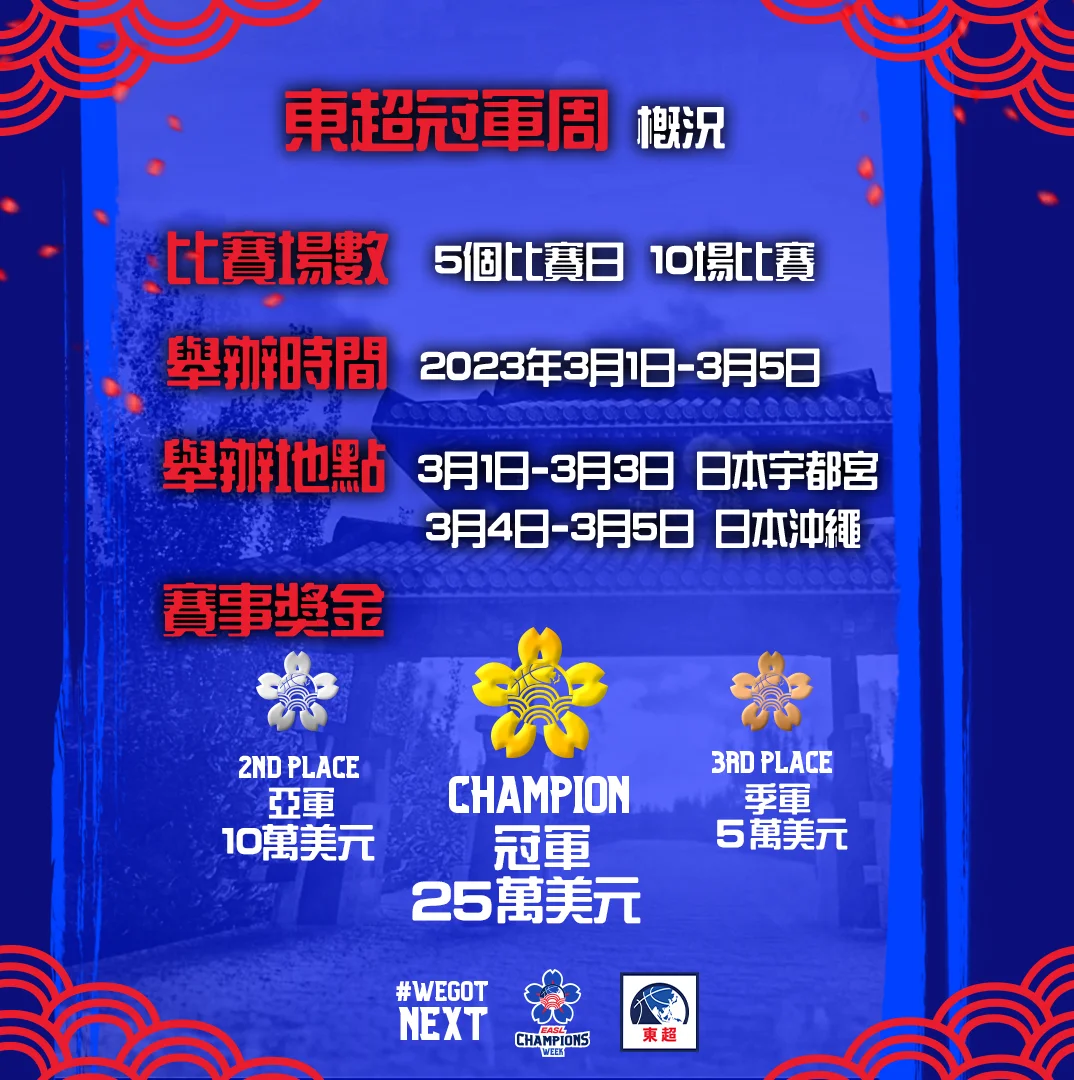 參加東超冠軍周的8支球隊,皆是來自東超合作聯盟日本B聯賽、韓國KBL、菲律賓PBA、中華台北P. LEAGUE+的衛冕冠軍和亞軍及東超種子球隊灣區翼龍,將為總冠軍獎杯及豐厚獎金展開激烈競爭。其中,冠軍將獲得25萬美元,亞軍和季軍分別是10萬美元和5萬美元。
