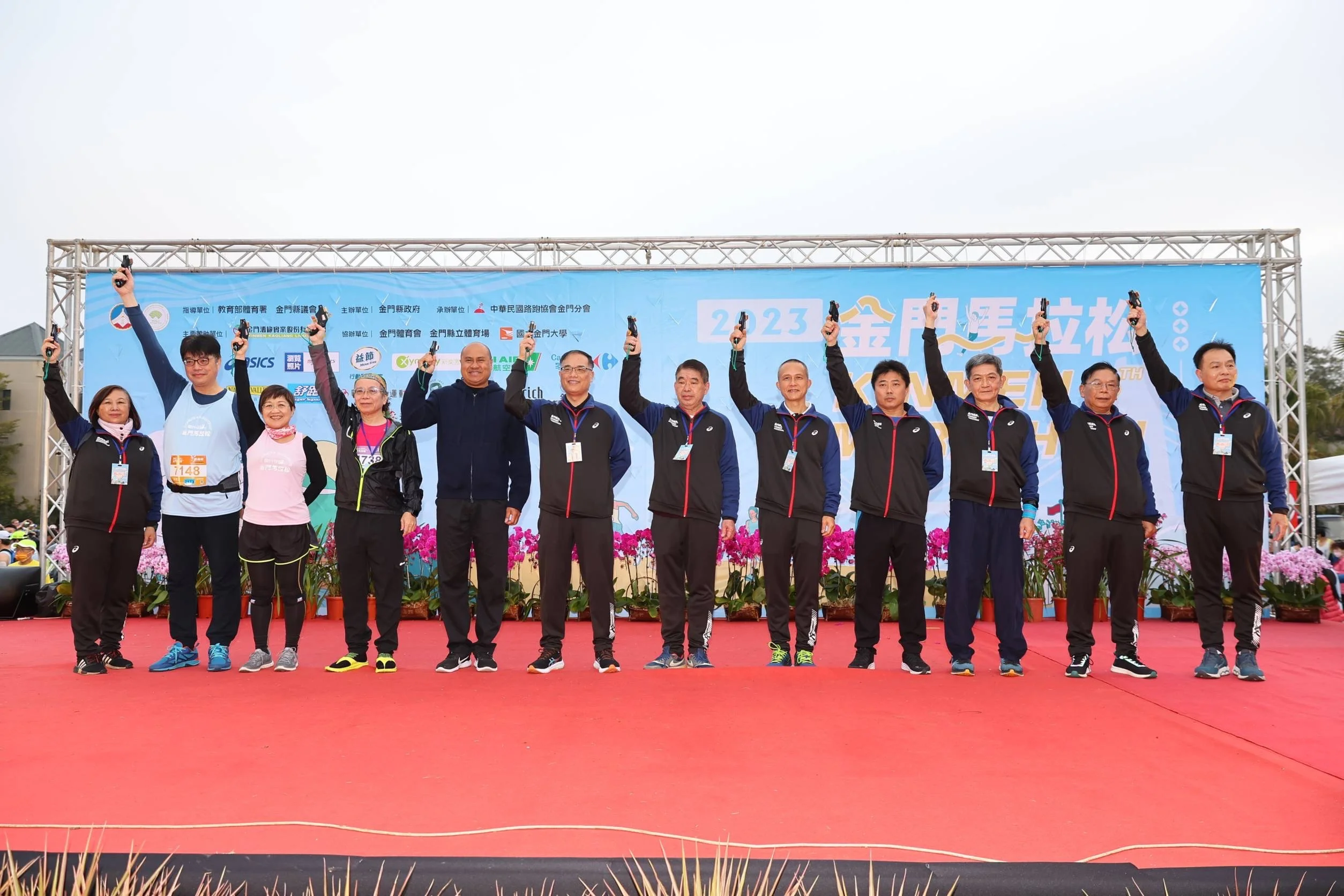 12日清晨的天空相當作美,跑者的熱情更是讓金門縣立體育館熱鬧得起來,對跑者來說是一個容易破PB的好天氣!今年由樂天女孩啦啦隊為賽事進行開場暖身,由主持人介紹李文良副縣長、張景森政委、僑委會委員長徐佳青委員長、陸委會邱垂正副主委、台北市體育局蔡培林副局長、澎湖縣許錫棋副處長、南投縣政府陳正昇前副縣長、吳美玲副處長、連江縣王禮民處長、體育會唐麗輝理事長及遠道組團而來的帛琉觀光部部長尼奈等人,相繼上台後,李文良副縣長也代表縣長向所有跑者問候,歡迎選手參加離島最大型的馬拉松賽事,這也是歷年金門馬拉松出席率最高的一年(約94%)。