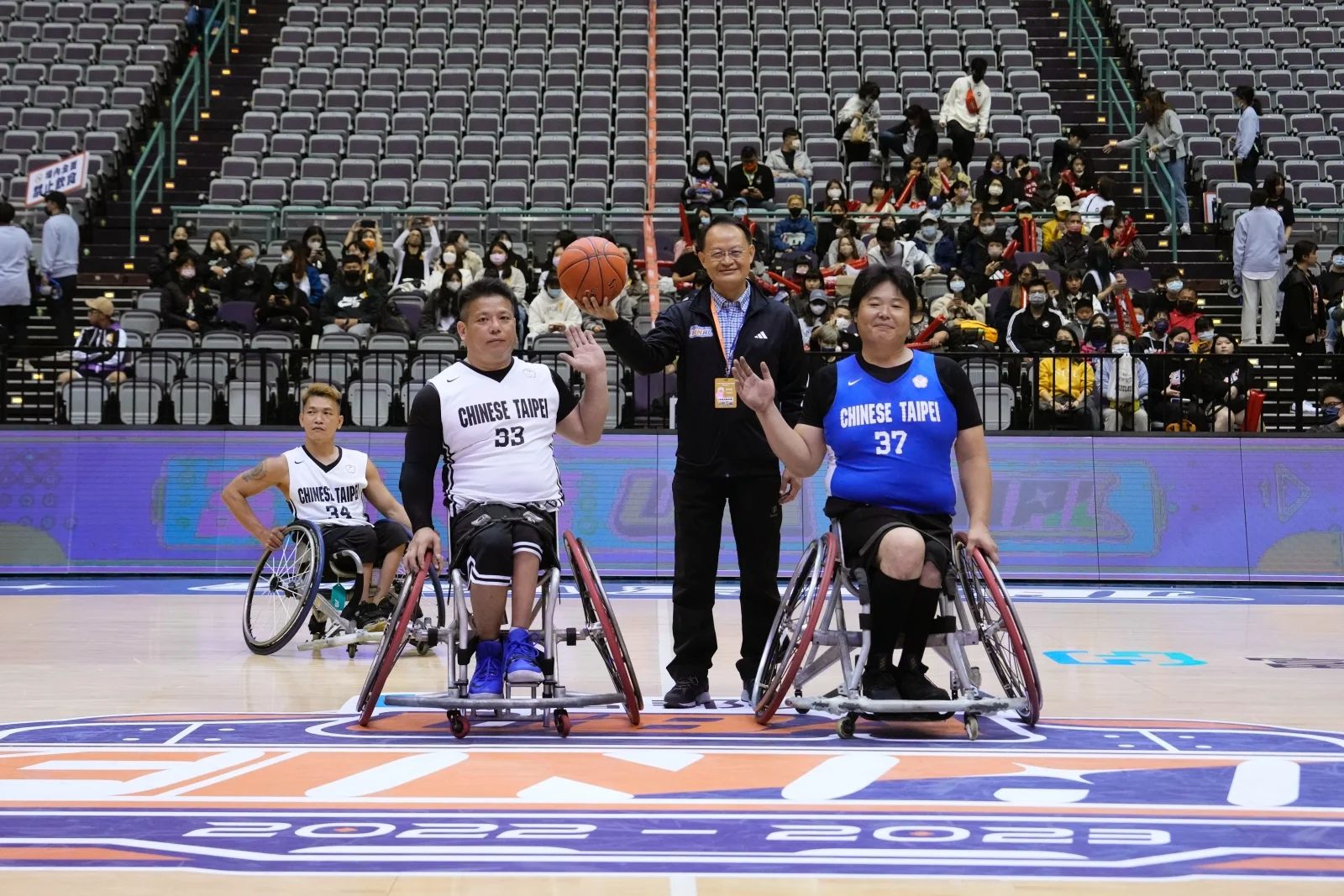 大專體總與富邦人壽攜手推動UBA賽事向運動平權精神接軌,今年讓輪椅籃球進軍小巨蛋進行公益賽,教育部體育署學校體育組組長蔡忠益特地為此賽事進行開球,並在這意義非凡的時刻,勉勵參與賽事的代表隊教練、球員,也期許在各單位的共同努力之下,讓輪椅籃球能獲得更多的關注。