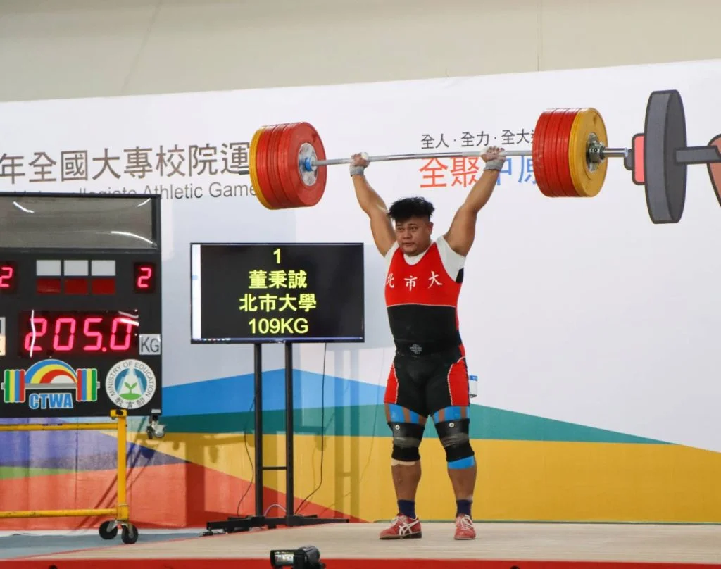 代表北市大學出賽的舉重好手董秉誠今日在112年全大運公開男子組109公斤級賽事完成三連霸,不過抓舉項目狀況不佳,僅第一次試舉156公斤成功,後續挑戰165公斤、169公斤皆失敗,在挺舉項目第二次試舉,以205公斤打破大會紀錄,並以總和361公斤收下金牌。