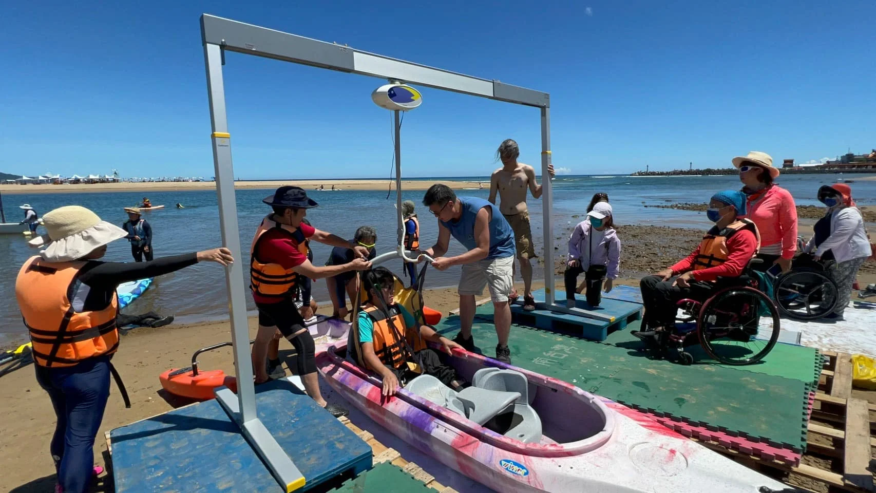 「新北市水域活動體驗營」邁入第11年,今年在蘆洲微風運河特別開出身障獨木舟場次,將安排復康巴士協助身障朋友前往活動場地,使用特製的身障專用獨木舟,現場備有移位機協助無法自行移位的身障朋友進船艙,由教練講解教學,讓身障朋友在教練及工作人員的引導下體驗水上划獨木舟的樂趣。