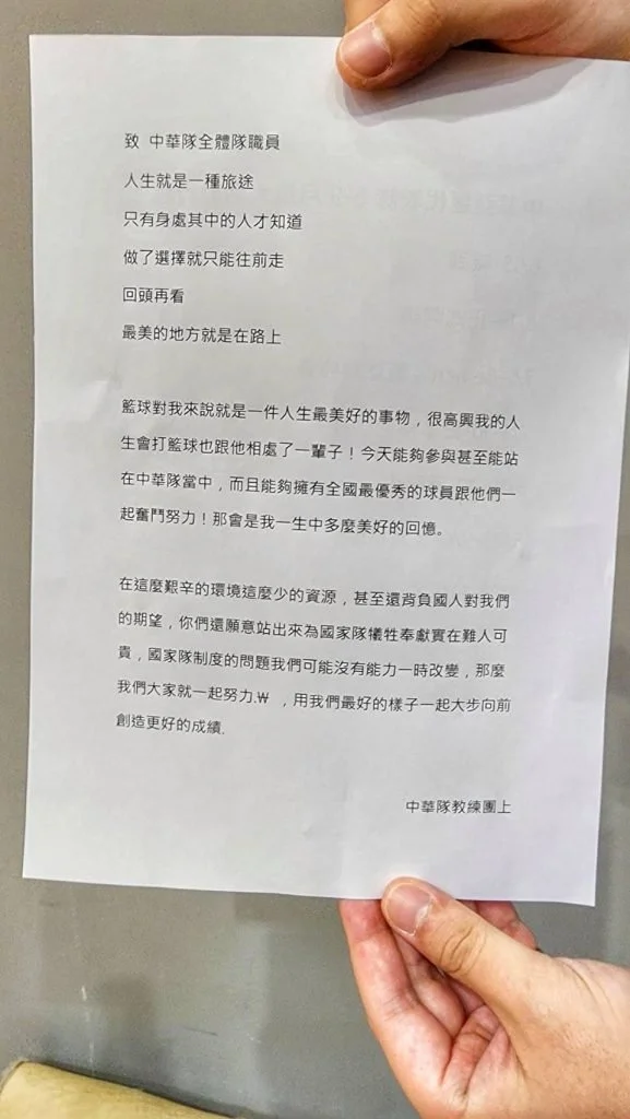 杭州亞運進入倒數百日,中華男籃培訓隊這天啟動報到、在晧宇國際亞洲區籃球培訓中心丈量服裝與領取裝備等行前作業,但在開始之前,總教練桑茂森集結團隊,特別寫下一封信,給每位國家隊成員,感謝他們結束辛苦賽季後,還願意接受徵召,一同征戰杭州亞運。