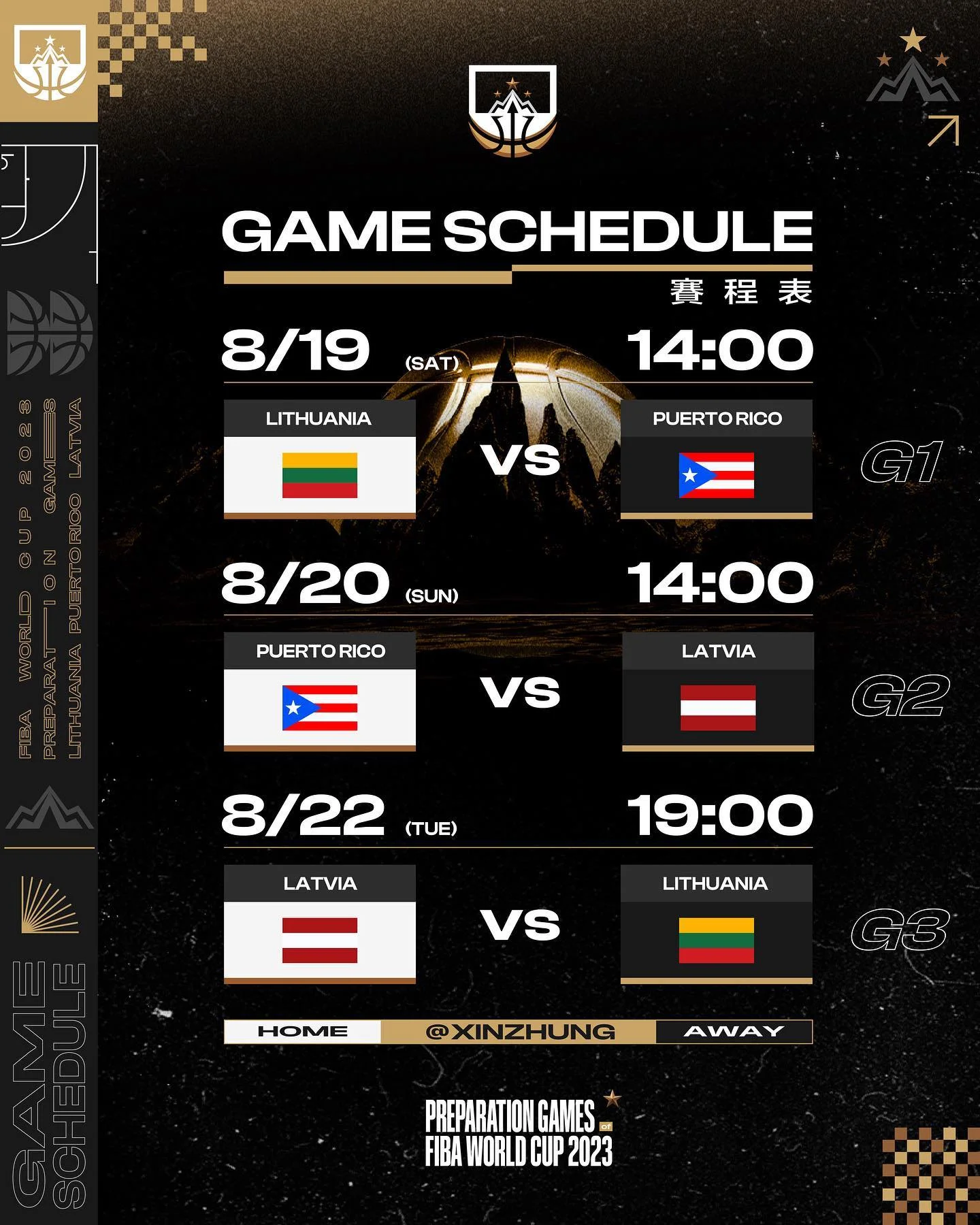 2023年FIBA世界盃籃球賽事由日本、菲律賓及印尼聯合舉辦,共有32支隊伍,將有7支隊伍及2024奧運主辦國法國可取得2024奧運門票。8月19、20、22日於新莊體育館舉行的熱身賽,其中立陶宛、蒙特內哥羅、墨西哥、埃及分屬D 組,8 月19 日首場賽事將由立陶宛對上波多黎各,8 月20日由波多黎各出戰拉脫維亞,8 月22 日則是拉脫維亞與立陶宛的對決,屆時將很有機會一睹國王隊中鋒Domantas Sabonis(立陶宛)、鵜鶘隊中鋒 Jonas Valančiūnas(立陶宛)、鵜鶘隊後衛Jose Alvarado(波多黎各)、賽爾蒂克隊大前鋒Kristaps Porzingis(拉脫維亞) 、雷霆隊大前鋒Davis Bertans(拉脫維亞)等NBA現役大咖球星現身於新莊體育館,想進場看比賽的朋友,門票將於6/30中午12點於拓元售票系統開賣(https://reurl.cc/RzeEkg)!更多熱身賽賽事資訊請鎖定「新北運動聚點」及「T1 LEAGUE」粉絲專頁。