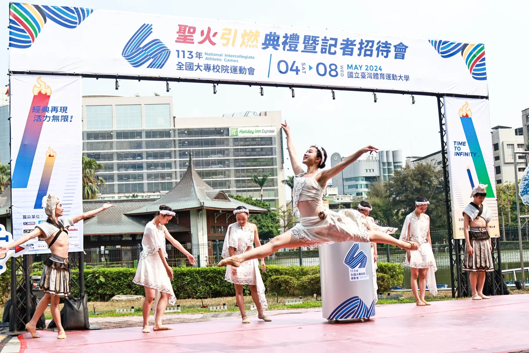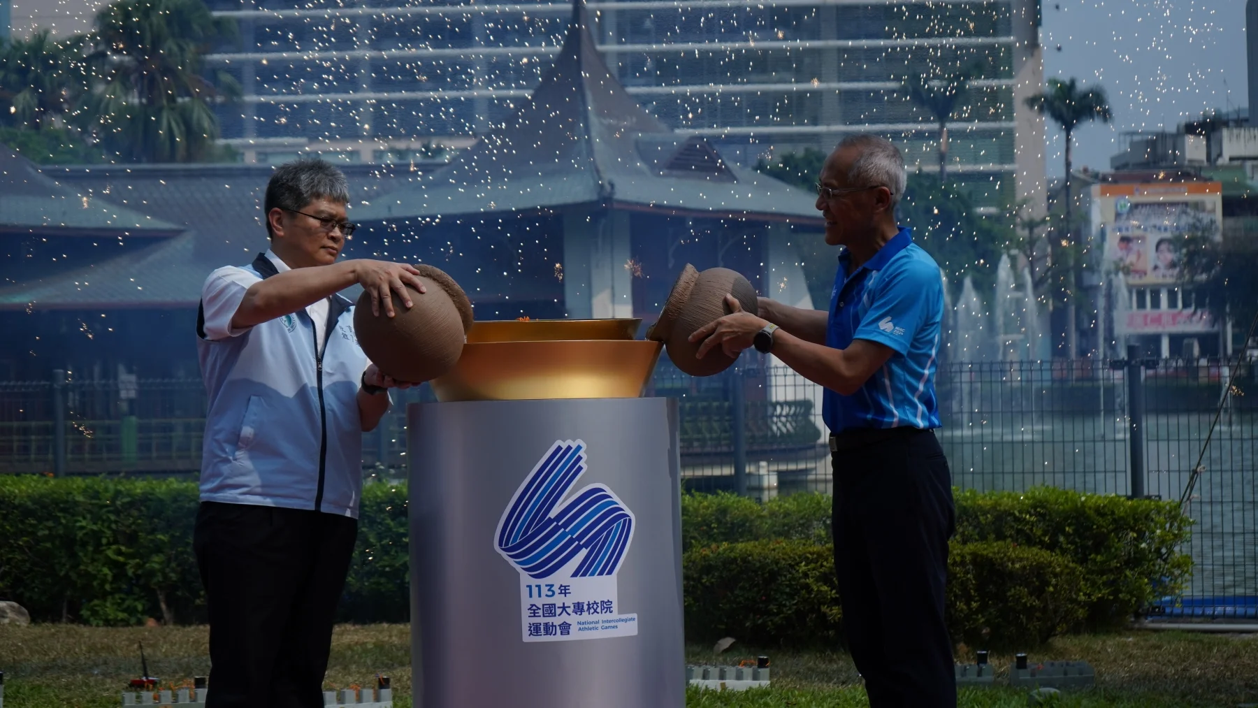 聖火引燃儀式,以歐風洋式建築的湖心亭為背景,搭配穿著古希臘風格服裝的舞者,引日月湖中日月精華之水,臺灣體大校長許光麃與體育署副署長房瑞文手持乘載千年歷史的繩紋陶罐,舀起在地臺中湖水,典禮中在身穿象徵希臘傳統服飾的舞者曼妙舞姿襯托下,穿越中西歷史長廊,成功取燃本屆全大運的聖火,揭開113年全國大專院校運動會序幕。