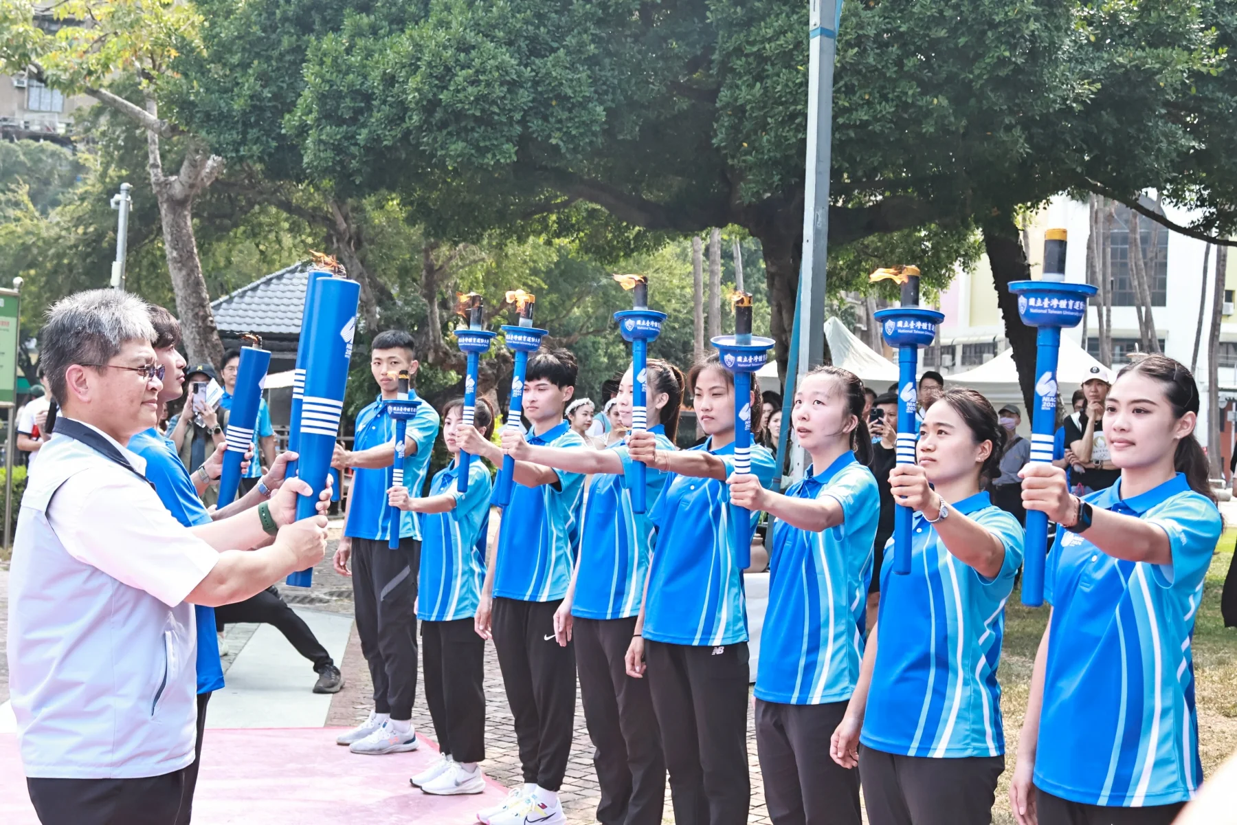 東京奧運男子柔道銀牌選手楊勇緯手持聖火火炬,由臺灣體大校長許光麃手中引燃聖火,再交給臺灣體大九個科系代表的聖火傳遞手手中,完成神聖莊嚴的引燃典禮。