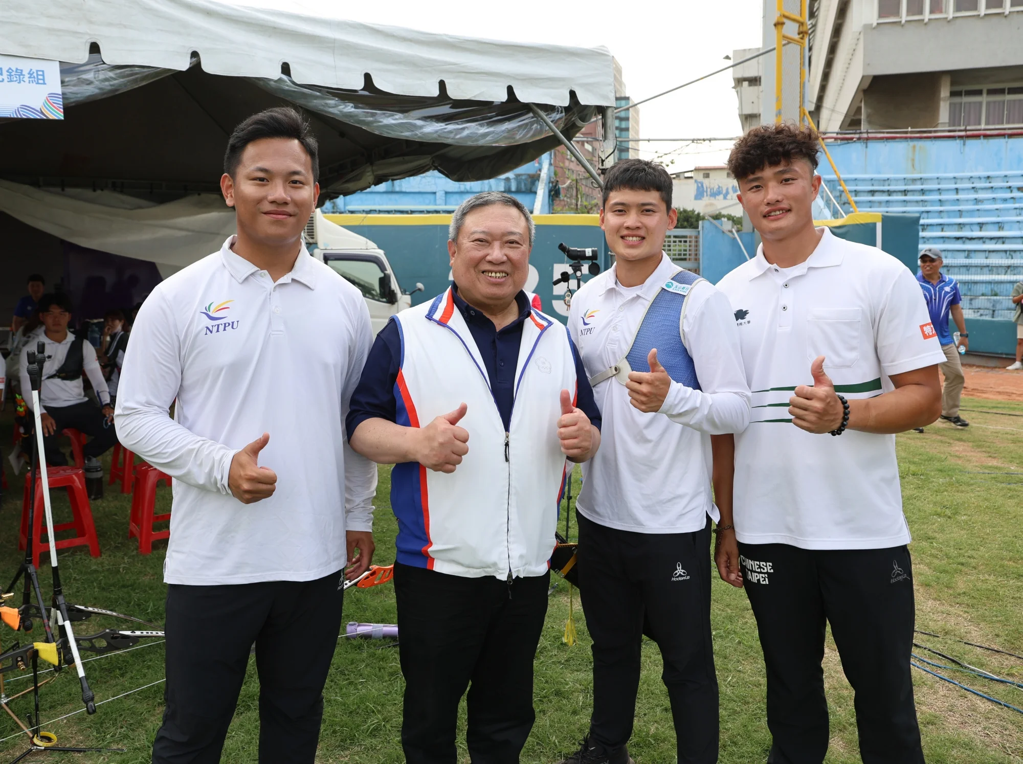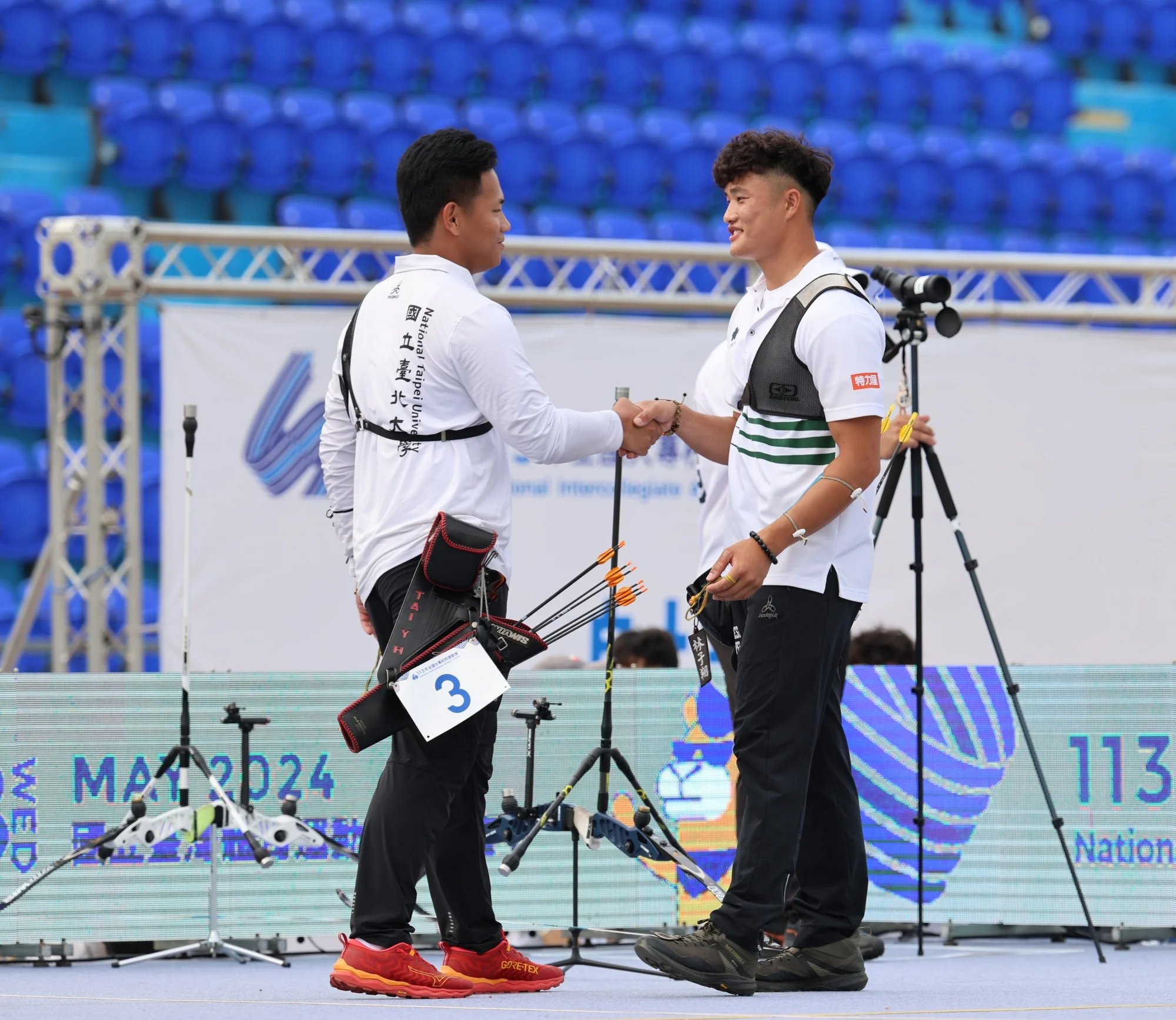 巴黎奧運射箭男子培訓隊湯智鈞、戴宇軒和林子翔,剛贏得射箭世界盃上海站反曲弓男團銅牌,回台後,三人立刻投入113年全國大專院校運動會,各自延續好狀態,今天(4日)決賽為校射下佳績。奧培隊三人包辦反曲弓個人賽頒獎台,國立體大林子翔贏得全大運生涯個人首金,湯智鈞則搭檔隋昀瑾,代表台北大學射下混雙金牌。