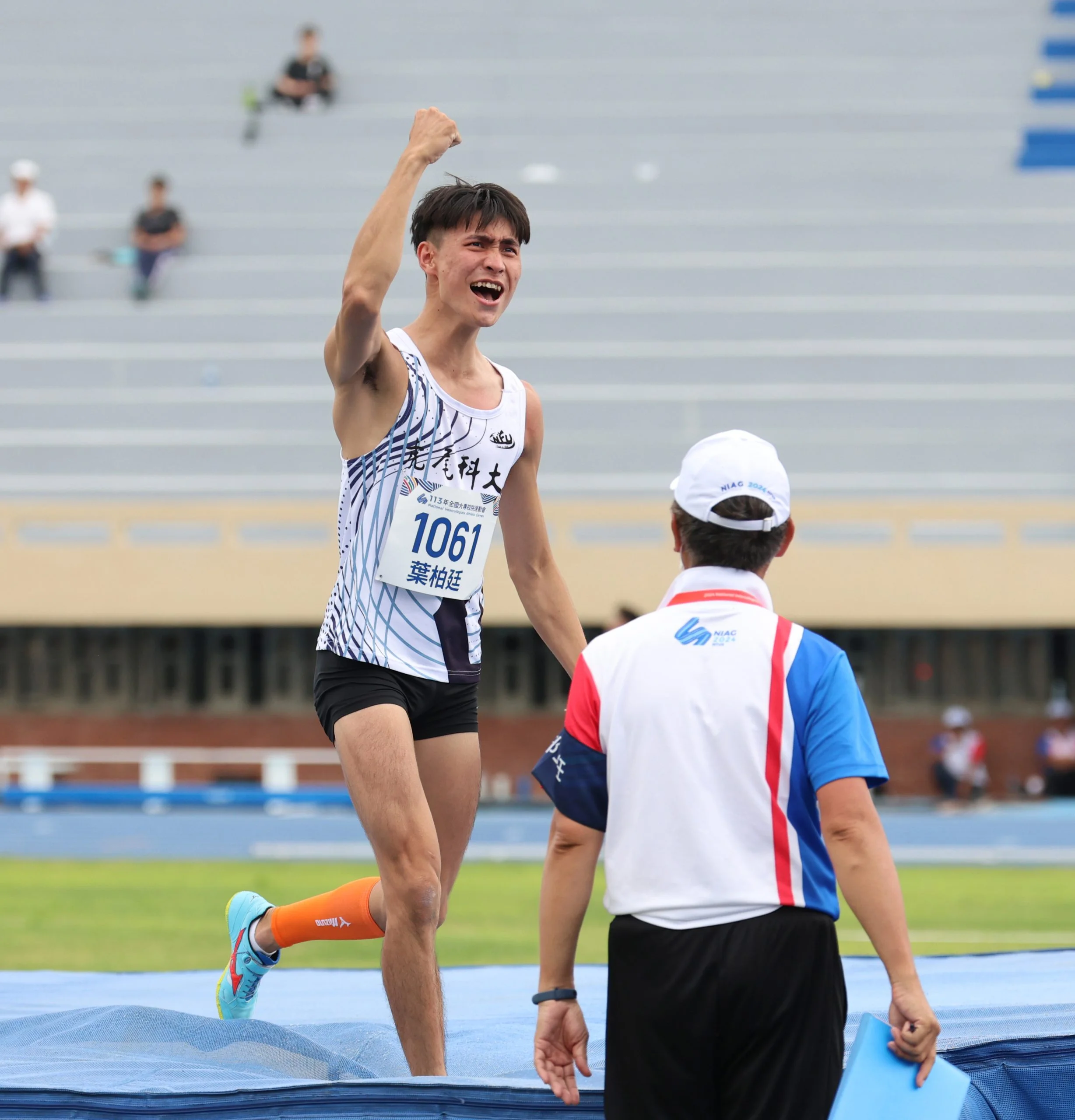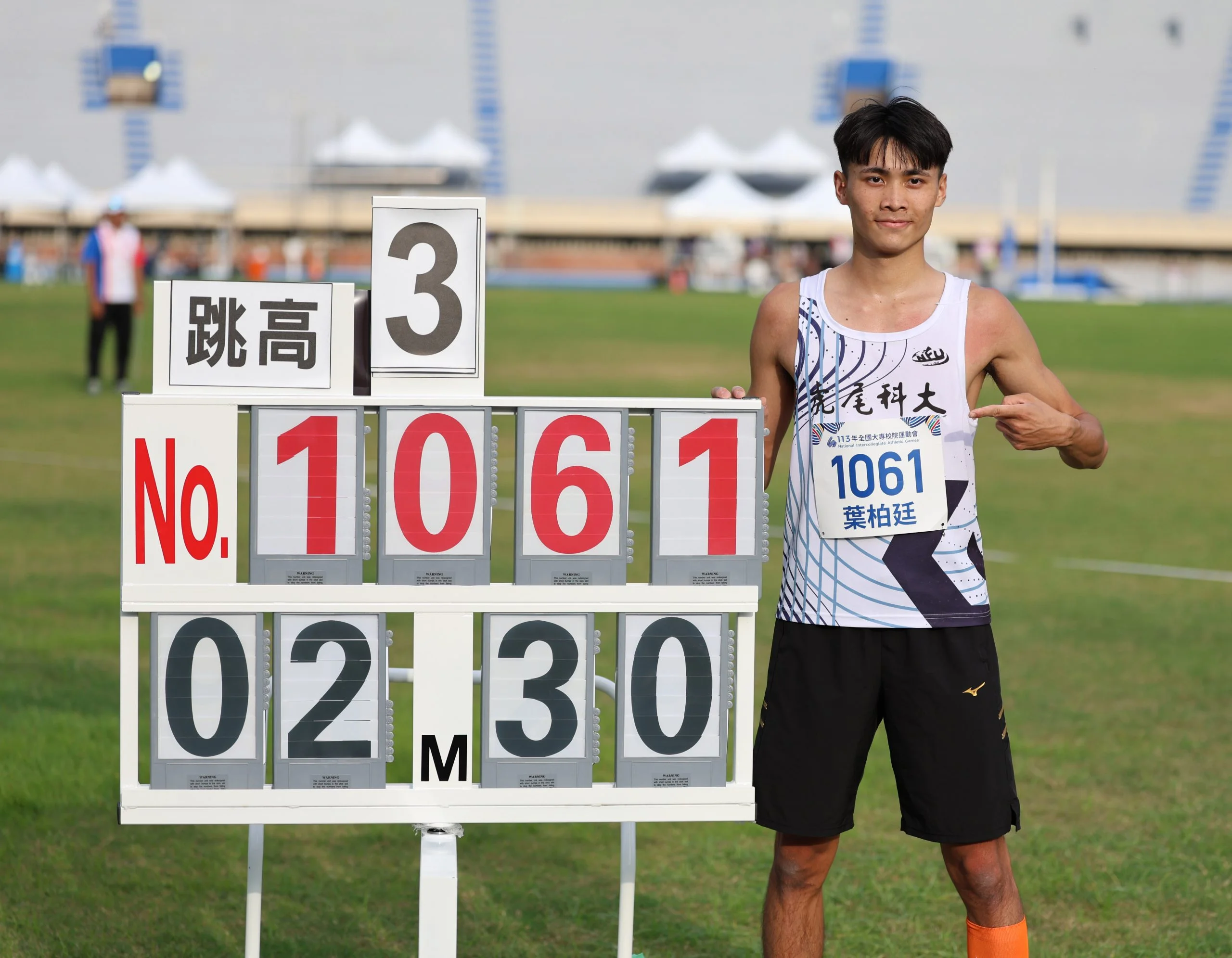 虎尾科大葉柏廷今天在113年大專校院運動會公開男生組跳高決賽,跳出振奮人心的2公尺30,飆破9年前由向俊賢締造的2公尺29全國紀錄,摘下全大運金牌還成為新科全國紀錄保持人。