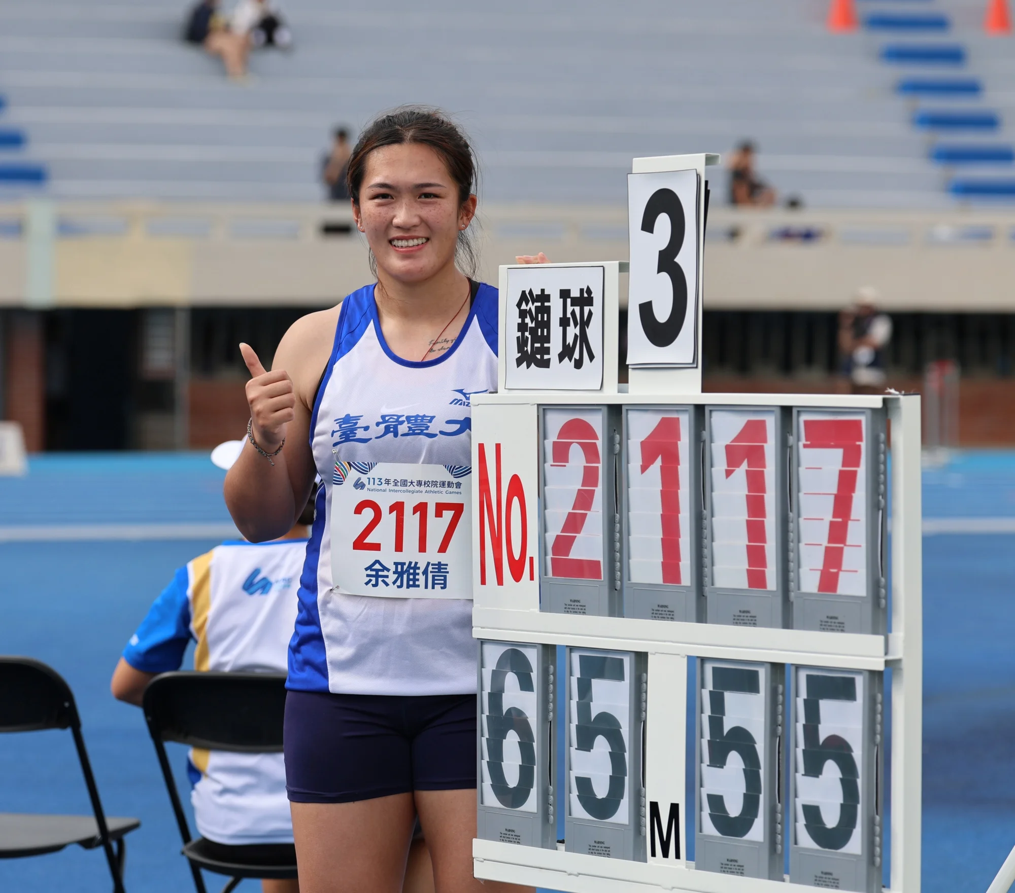 回到學校出賽倍感溫馨,台灣女子鏈球全國紀錄保持者余雅倩,代表地主臺灣體大,出賽113年全國大專校院運動會,田徑公開女生組鏈球決賽,擲出65公尺55,突破原先個人所保持的大會紀錄64公尺12。賽後她感激田徑協會,過去兩個多月的協助,前往中國江蘇淮安移地訓練,收穫頗豐,期待夏天再出發取經。
