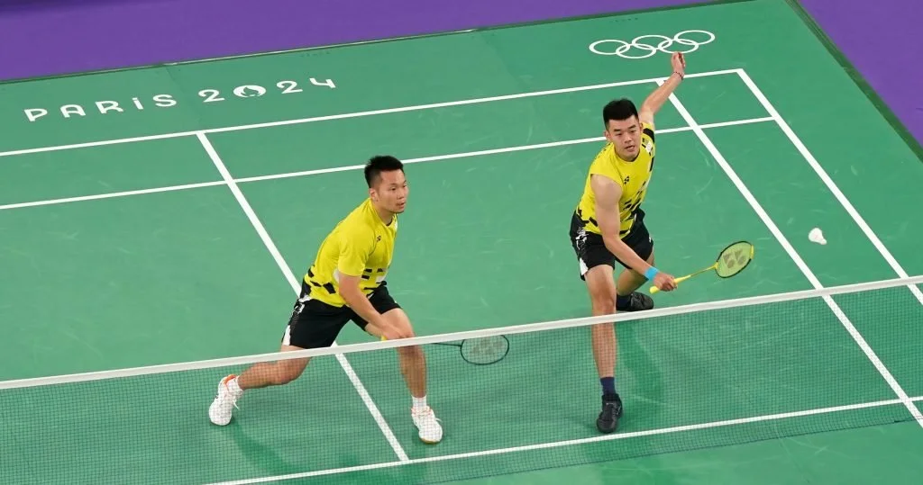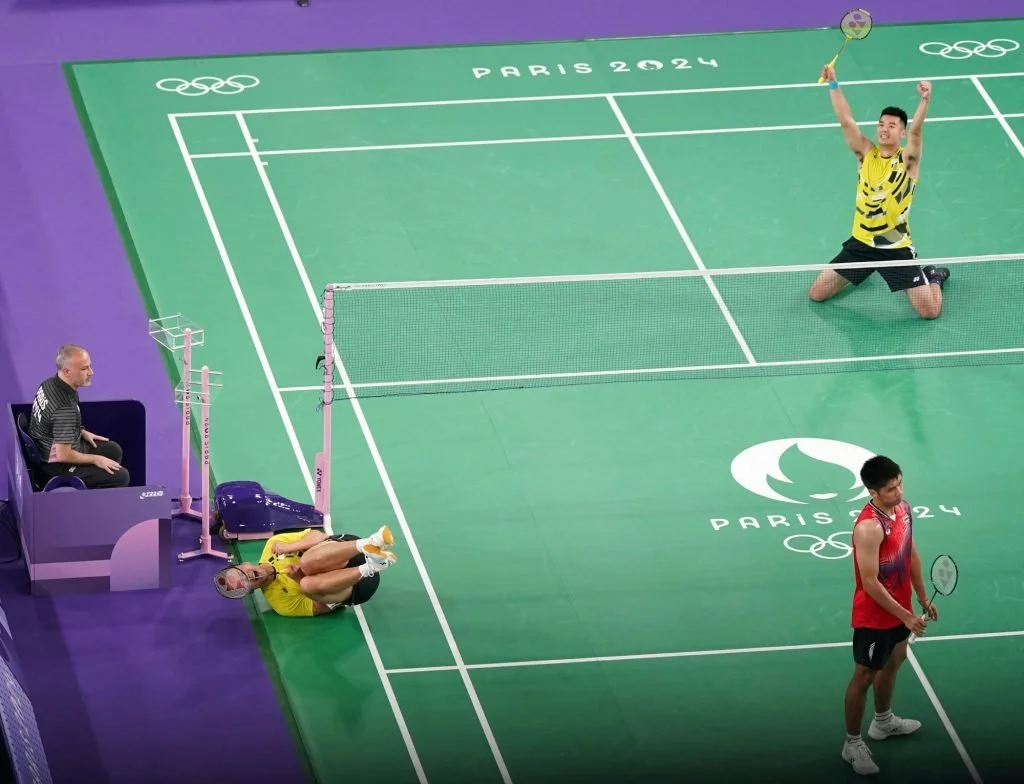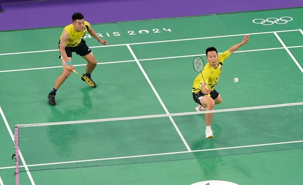 連拿5分,搶下賽末點後,我國羽球黃金男雙「麟洋配」王齊麟/李洋,興奮在場上慶祝,前者捶地振臂,後者甚至滑到對方場上,衛冕軍順勢挺進巴黎奧運羽球男雙四強。