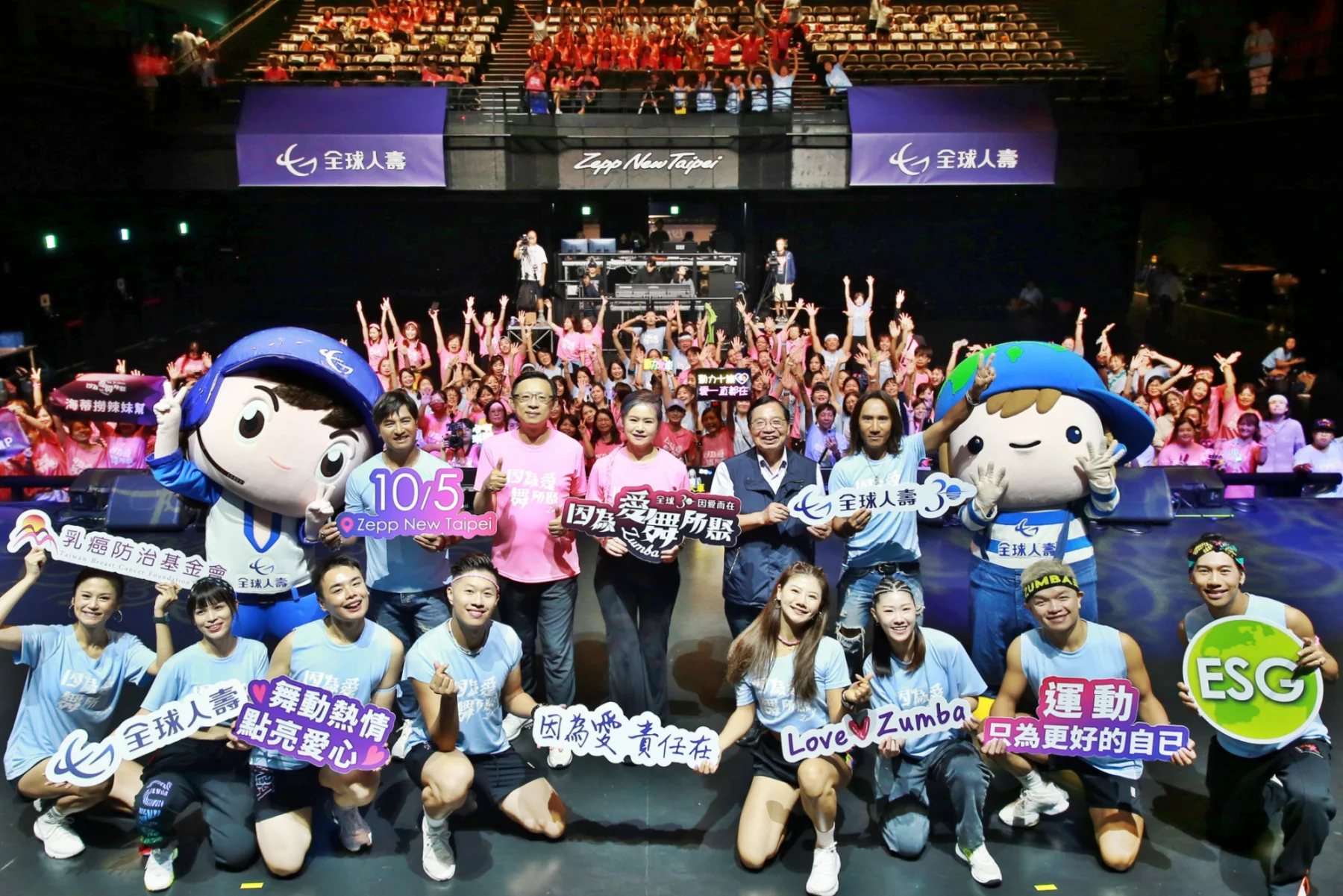 全球人壽歡慶30周年,舉辦『全球人壽「因為愛 舞所聚ZUMBA」公益活動》,今日(10/5)在新莊宏匯廣場Zepp New Taipei盛大登場,由全球人壽董事長林文惠和專業師資團隊帶領民眾享受Zumba魅力,活動部分報名費捐贈乳癌防治基金會,並邀請活動愛心大使「動力火車」現場熱力開唱,活動結合運動、音樂及公益,更帶入「ESG企業永續」精神,傳遞企業正向永續的力量。