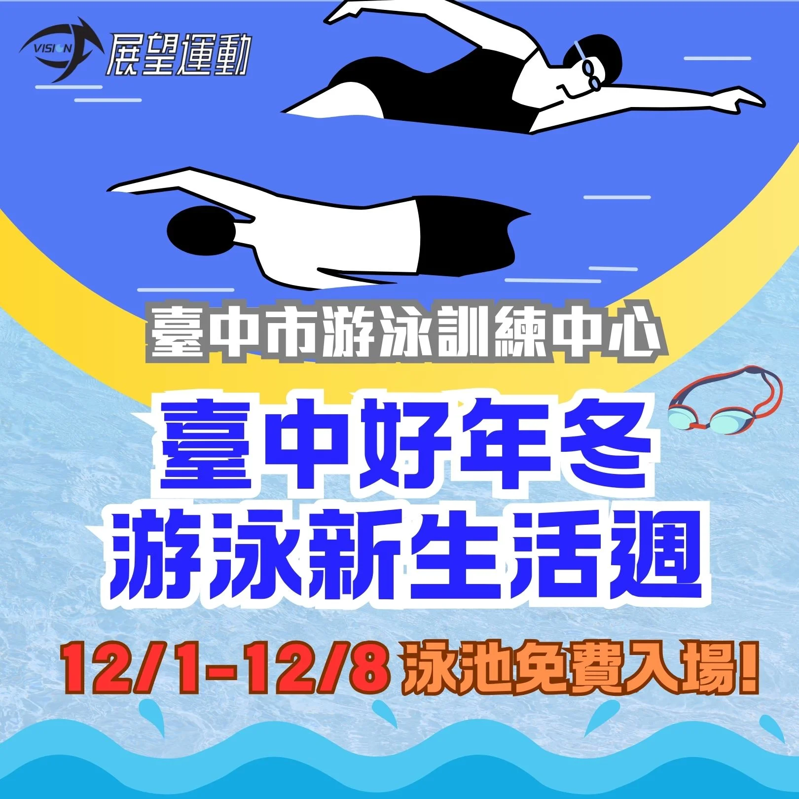 「臺中好年冬.游泳新生活週」活動為期8天,不需要任何證件也不用付費,就是要民眾踴躍在冬天也能持續游泳,用運動抵抗寒天、強健體魄。