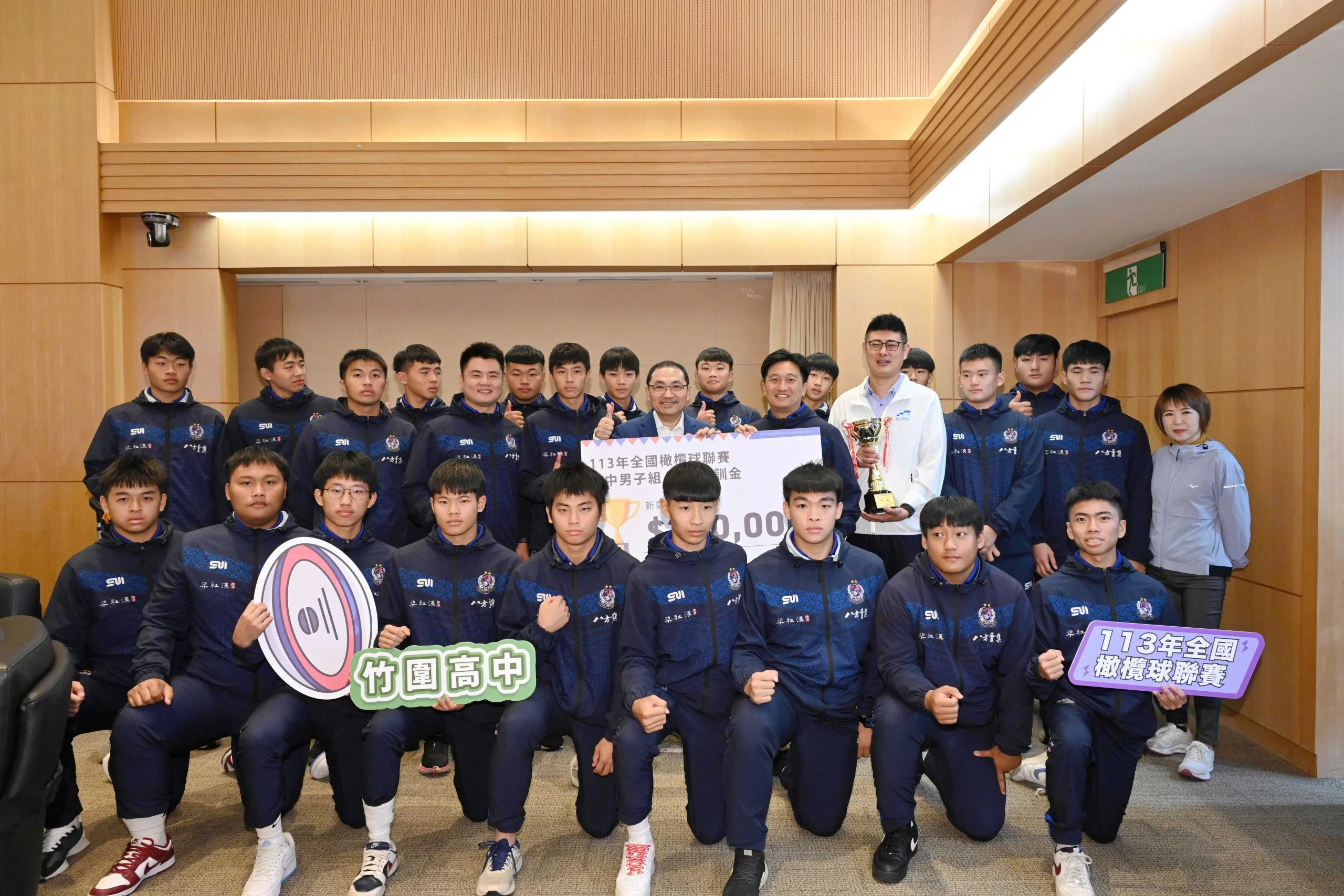 侯友宜表示,新北市淡水、三芝地區是臺灣橄欖球運動的發展重鎮,市府在今年建置並啟用全臺首座人工草皮、符合國際標準規格的「新北市國際橄欖球場」,且系統化推動橄欖球運動,從國小、國中至高中三級培育扎根,建構完整銜接體系。竹圍高中男子橄欖球隊成軍9年,歷經無數場國內大小賽事,獲獎無數,今(113)年能在全國橄欖球聯賽突破防線,一路過關斬將,決賽時擊敗黑衫軍建國中學及基隆八斗高中,以五場全勝的戰績首度贏得全國聯賽冠軍獎盃,為隊史寫下新紀錄,市府頒發20萬元做為培訓金,投入更多資源,鼓勵學校發展多樣化訓練方式,提升橄欖球隊競技實力,也期望未來再為隊史增添冠軍紀錄。