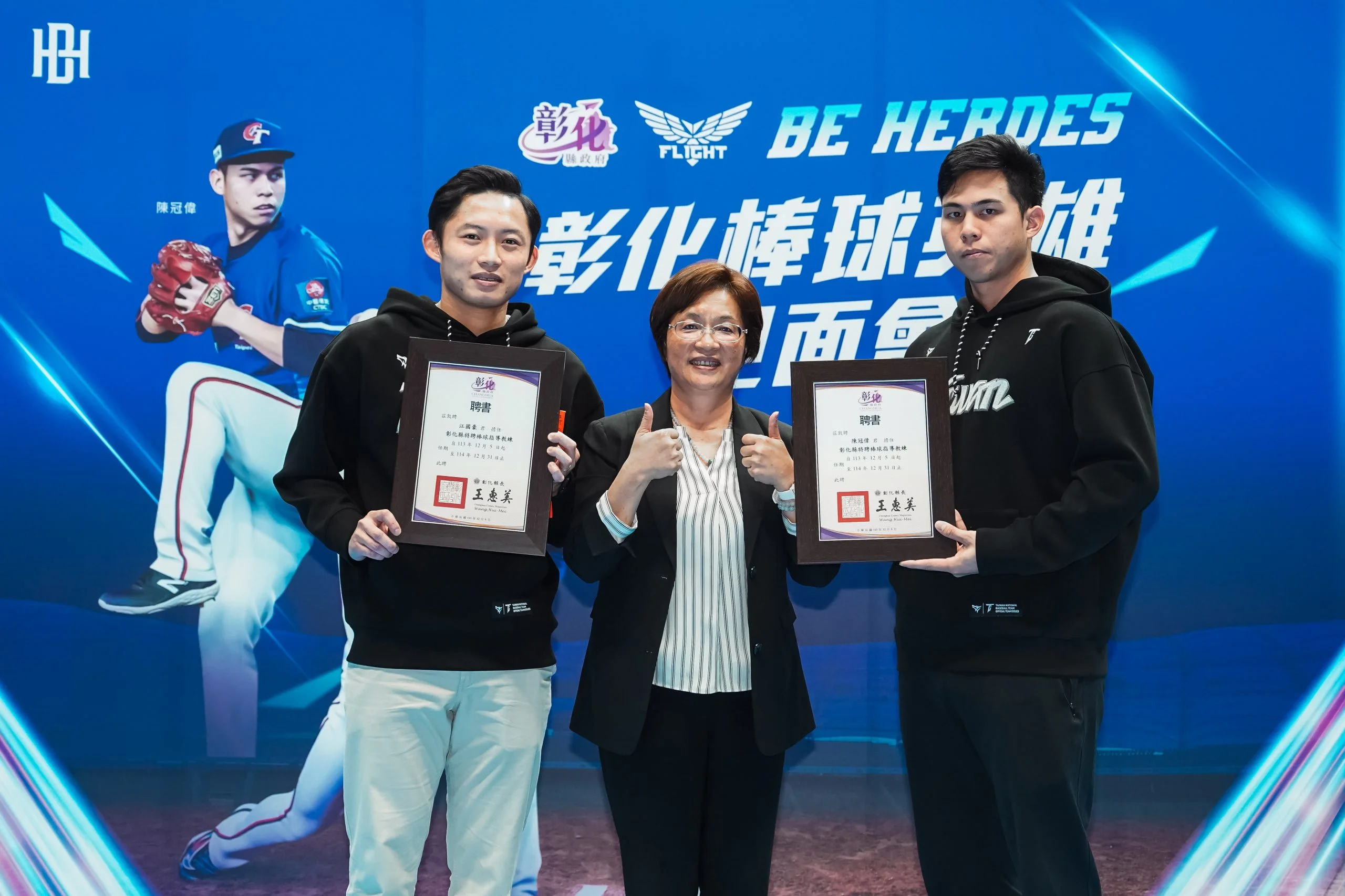 王縣長表示,未來縣府將持續推動棒球運動,將撥補「彰化縣運動發展基金」1,000萬元,縣府拋磚引玉,希望公私協力,為選手提供更多發展機會,能孕育出更多的彰化之光、台灣之光,同時也祝福江國豪與陳冠偉未來在職棒場上再創佳績,並為中華隊再奪世界冠軍。