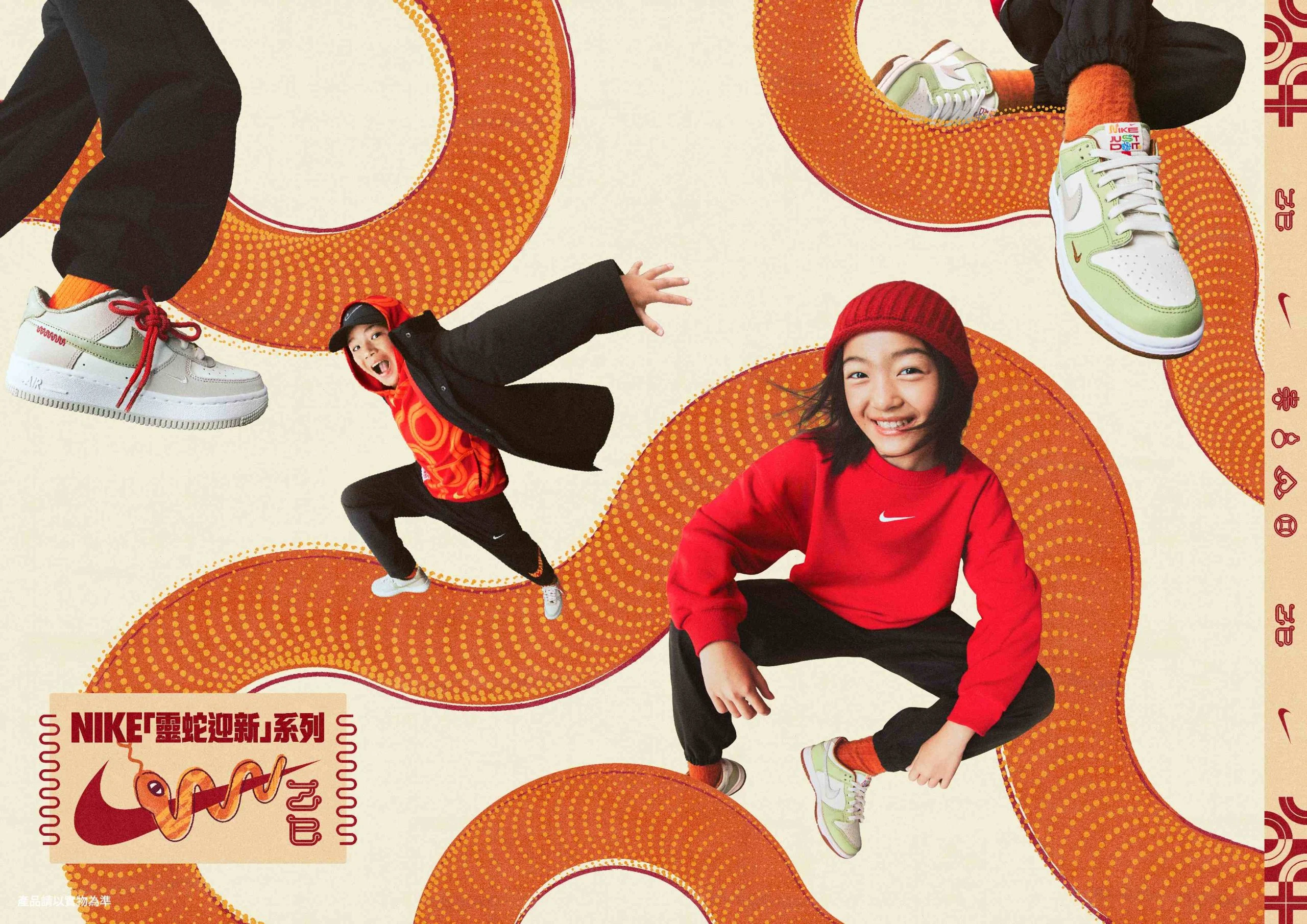 Nike「靈蛇迎新」兒童系列將充滿童趣的卡通蛇圖案融入產品設計,讓孩子們玩轉新年,能量滿滿。大童圓領運動上衣將卡通蛇圖案融入經典Swoosh 標誌,幫助孩子們新年好運相隨、靈活應變;大童款Nike Dunk Low和幼童款Nike Air Force 1則採用特色鞋舌標籤,與趣味新年裝飾巧妙結合,盡顯童真。