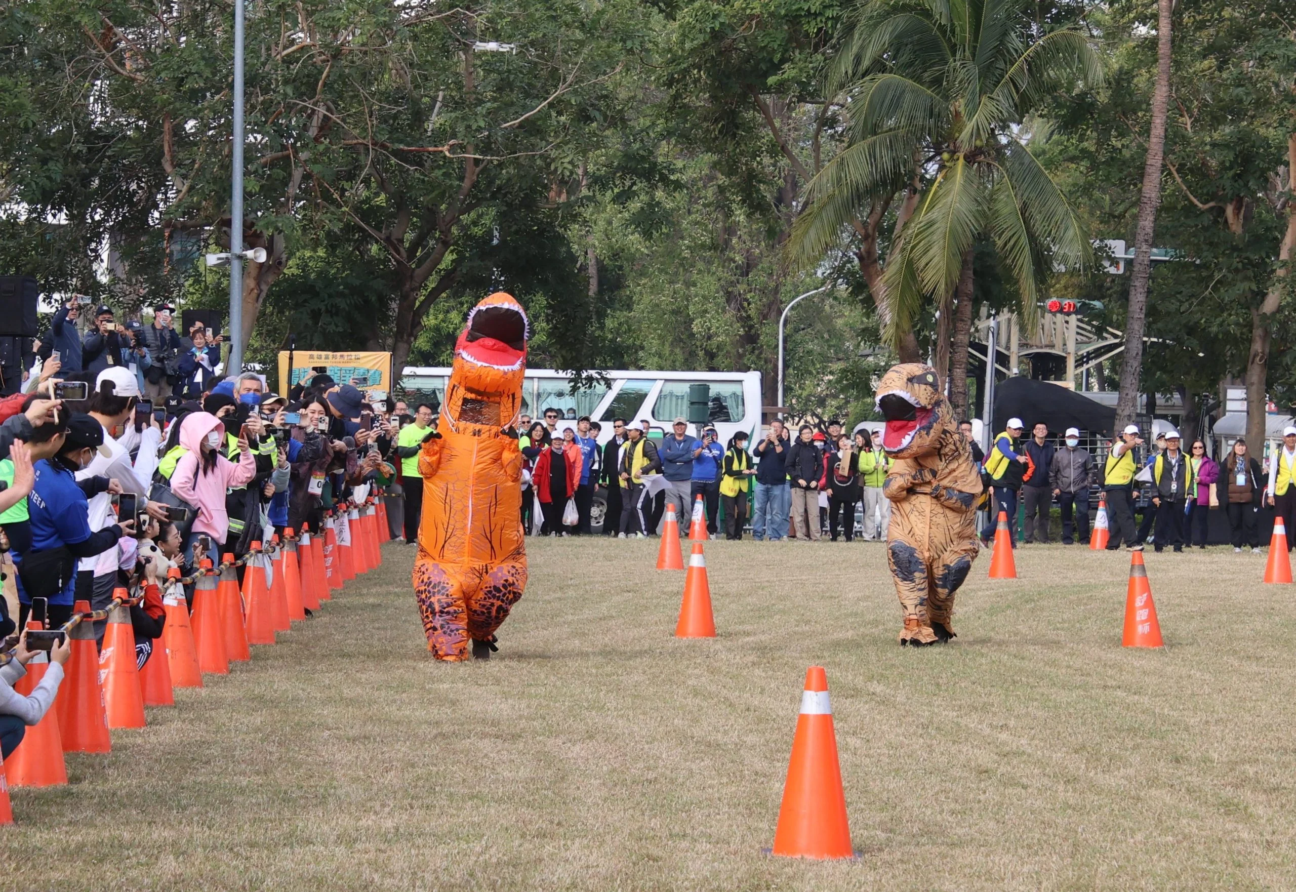 由高雄市政府運動發展局主辦、富邦人壽冠名贊助的「2025高雄富邦馬拉松」,今年以「Run to Love. Love to Run 越跑越愛 越愛跑」為口號,今(11)日首日活動由3公里休閒組打頭陣,緊接著恐龍親子變裝嘉年華及競速賽於國家體育場戶外草皮舉行,高雄市長陳其邁也換上恐龍裝下場一同較勁。陳其邁表示,高雄冬天氣溫非常適合馬拉松,自2010年開始舉辦城市馬,逐漸打開國際知名度,今年共有43個國家、326位外籍選手及各縣市跑者共約1萬3千多人參賽,希望來自各地的朋友,透過馬拉松認識高雄,體驗城市美景,品嘗在地美食,一兼二顧。