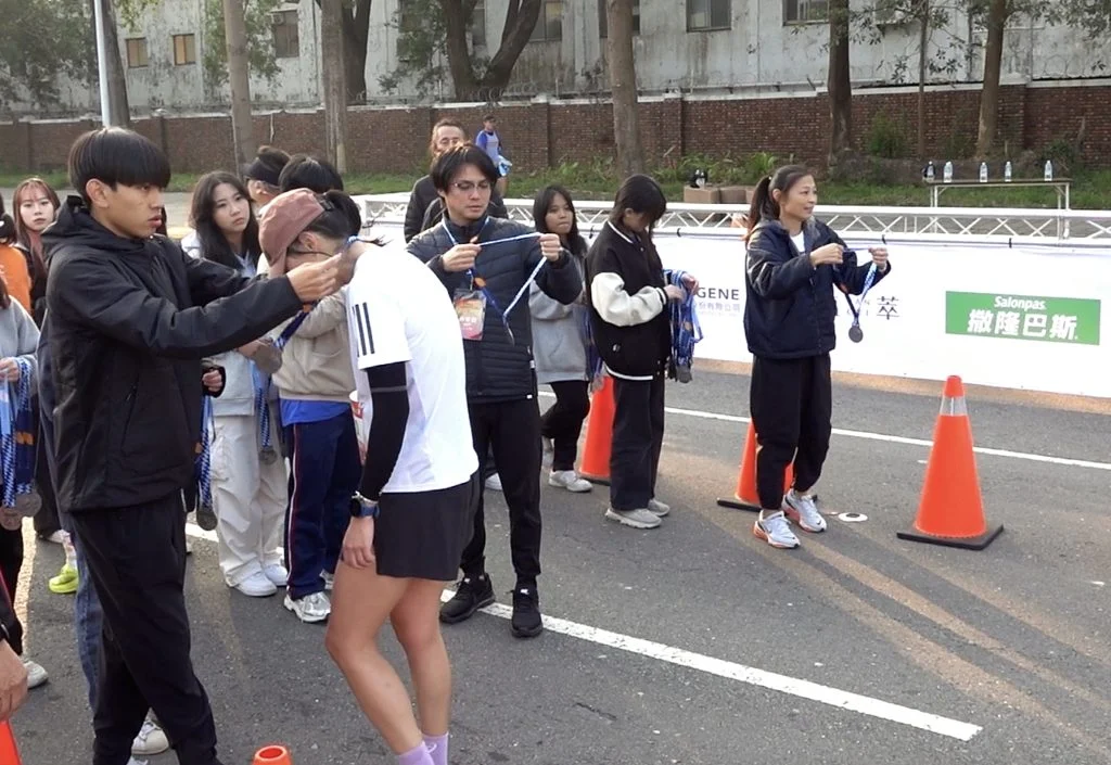 「辛苦了,恭喜完賽。」旅日小將簡子傑趁著寒假返台,參與2025高雄富邦馬拉松,身為高雄在地人的他跟仙台育英高校安藤拓也教練,以及媽媽馬拉松名將許玉芳一起為完賽跑者掛牌。