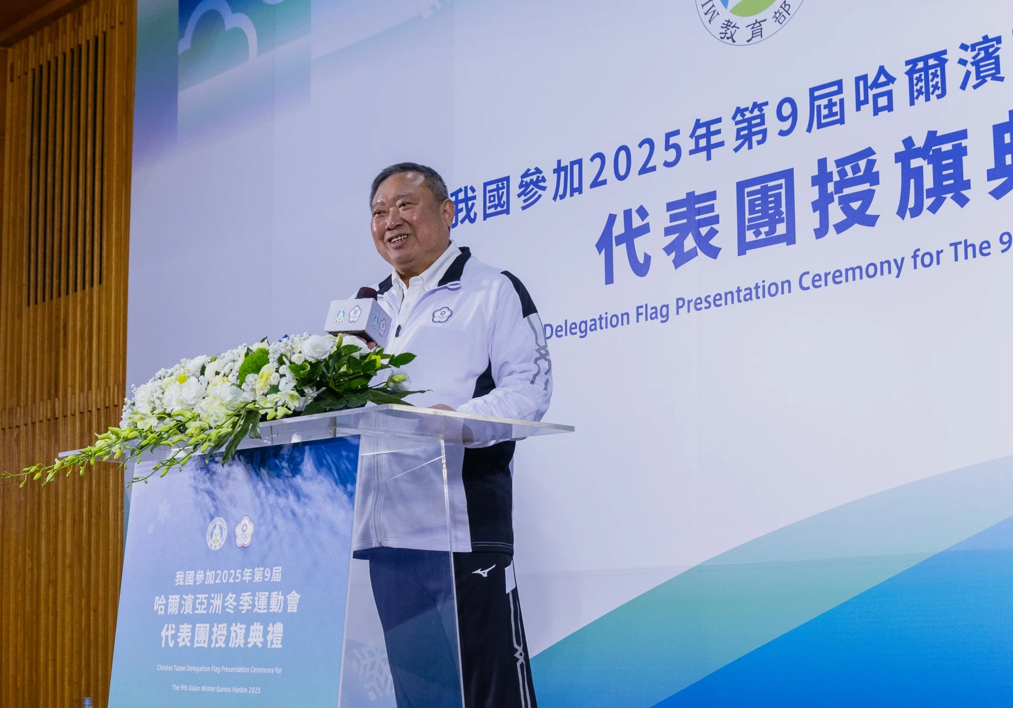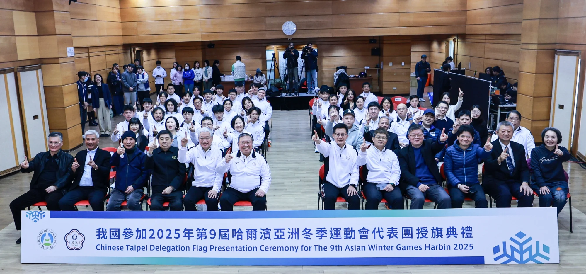 中華奧會與教育部體育署於2025年1月16日下午2時假體育聯合辦公大樓3樓大禮堂隆重舉行我國參加2025年第9屆哈爾濱亞洲冬季運動會代表團授旗典禮,由教育部次長張廖萬堅親臨主持授旗,為即將出征2025年第9屆亞洲冬季運動會的選手們加油打氣。本屆代表團規模創歷史新高,共派出67名選手(男38人、女29人)參加冬季兩項、冰壺、冰球、滑冰(競速、短道競速、花式)及滑雪(阿爾卑斯式、越野)等5種運動的競賽,加上教練與工作人員,總人數達110人,展現出我國冬季運動穩定成長的成果。