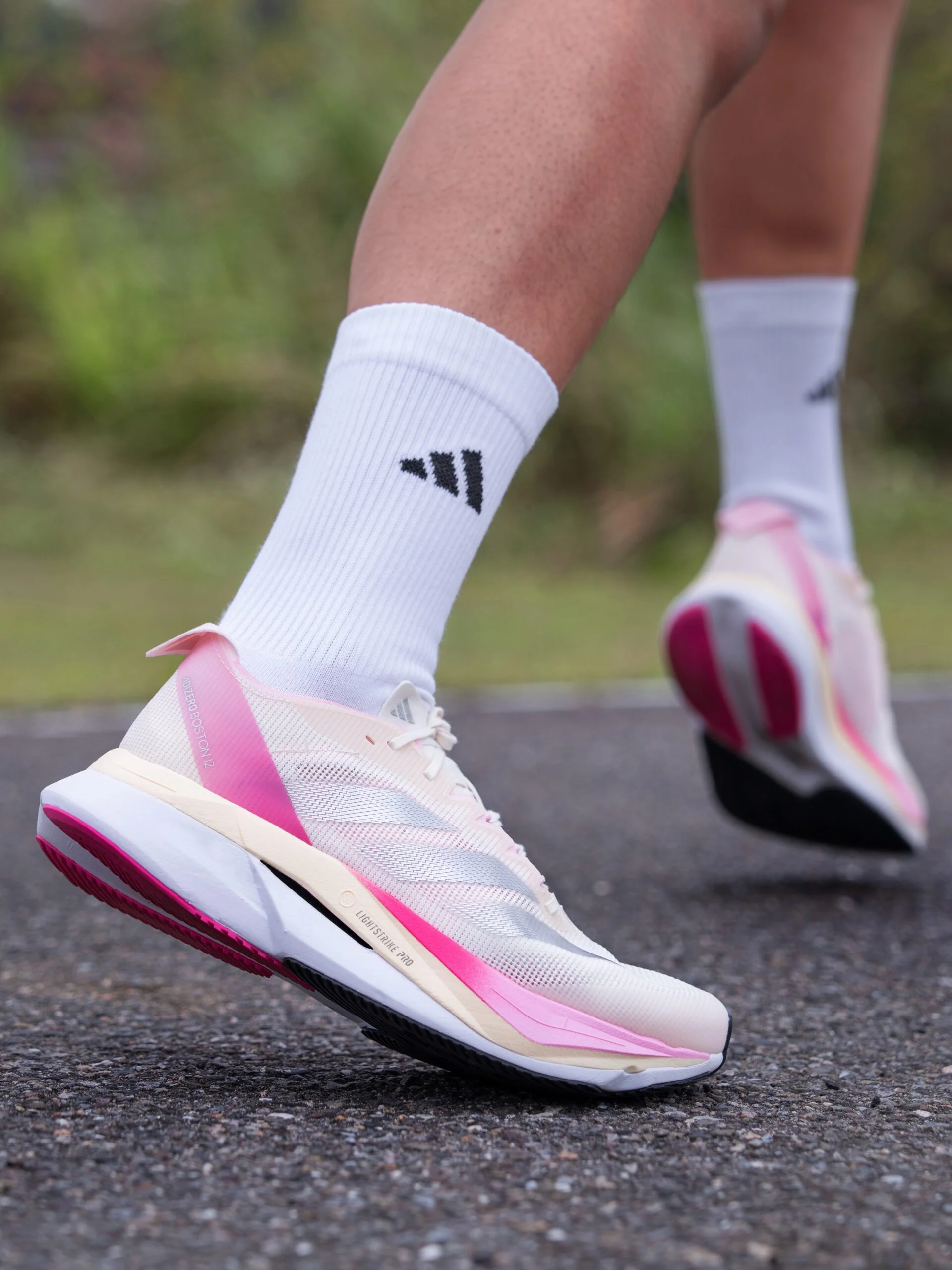 此次,去年底甫升級上市的競速碳纖跑鞋ADIZERO ADIOS PRO 4則推出緊跟潮流的新色-2025年度Pantone代表色「摩卡慕斯」的棕色,搭配adidas經典的三條紋,讓妳成為賽道上最時髦的菁英跑者。ADIZERO ADIOS PRO 4全新升級三大科技:前掌上翹弧線設計,增強推進能量;雙層LIGHTSTRIKE PRO中底,出色緩震;LIGHTLOCK輕量單向彈性編織網布鞋面,結合內置鎖定帶,在極速奔跑中帶來絕佳貼合感;LIGHTTRAXION大底搭配CONTINENTAL馬牌大底,止滑性能卓越,伴妳突破速度極限!