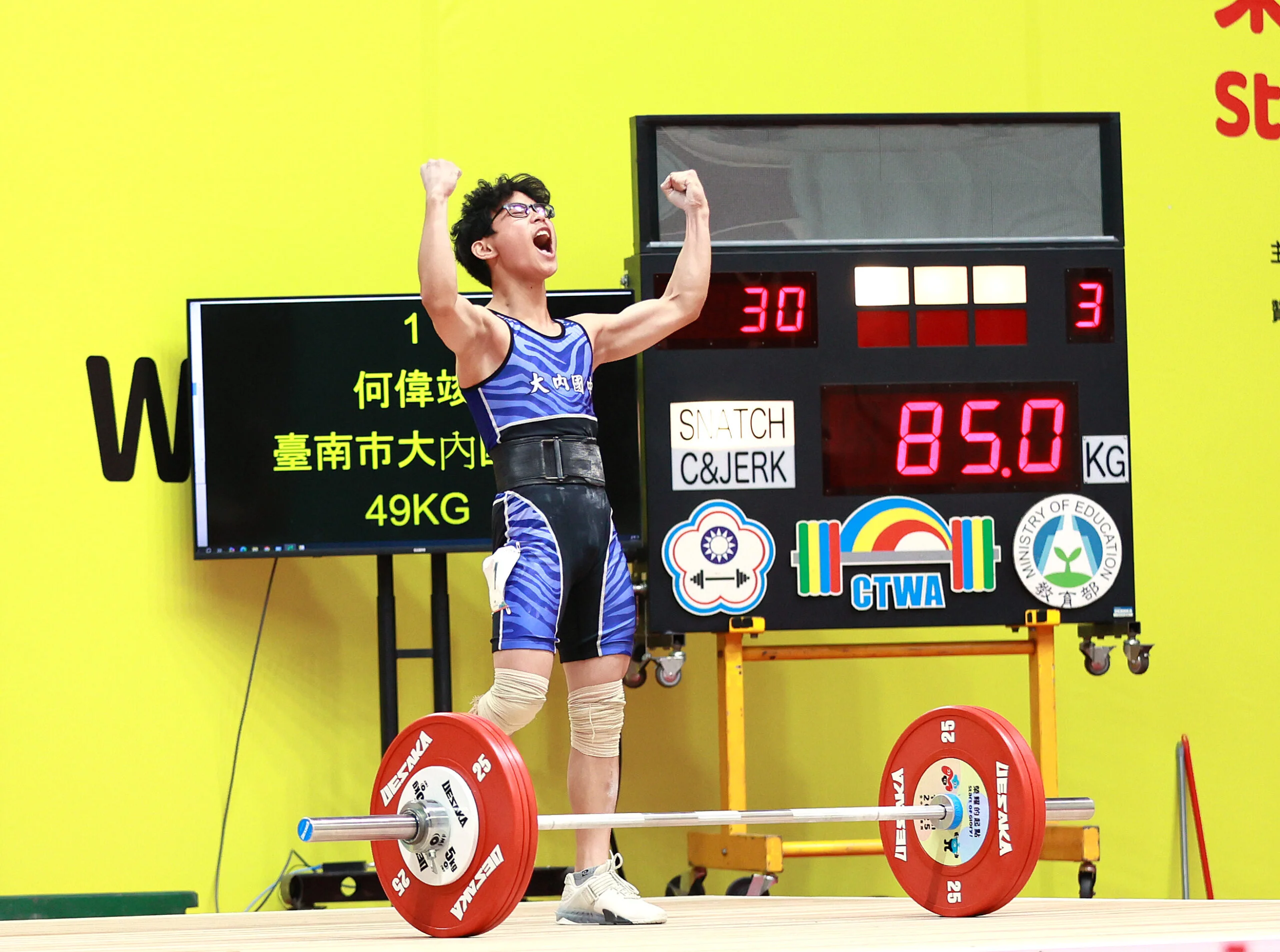 面對槓鈴,臺南市大內國中何偉竣握拳低吼一聲,提振士氣。他在臺南全中運舉重國男49公斤級決賽,以抓舉85公斤破大會,並超越個人保持的青少年全國紀錄,挺舉101公斤同樣創大會和青少年全國新猷,總和186公斤也改寫大會跟青少年全國紀錄,順勢拿下金牌,臺灣舉重傳統強權、大內國中為臺南市在本屆全中運舉重首日迎來開門紅。