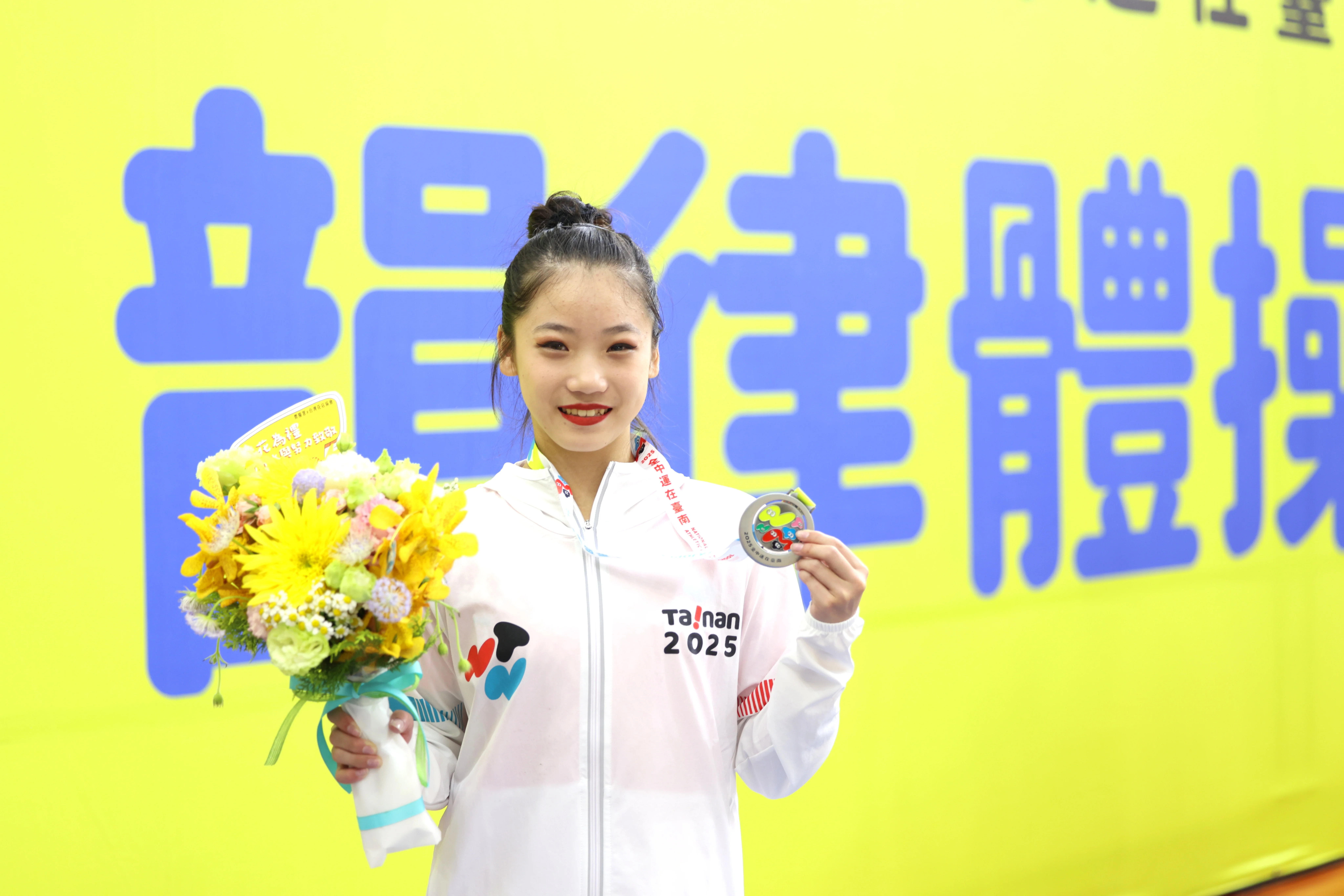 臺南市長榮中學鐘芮芃,今天在114臺南全中運韻律體操高女組個人全能決賽,四套都有亮眼表現,「環」21.800分、「球」24.117分、「棒」23.683、「帶」22.467分,以總分92.067為自己也為臺南市進帳一面銀牌。