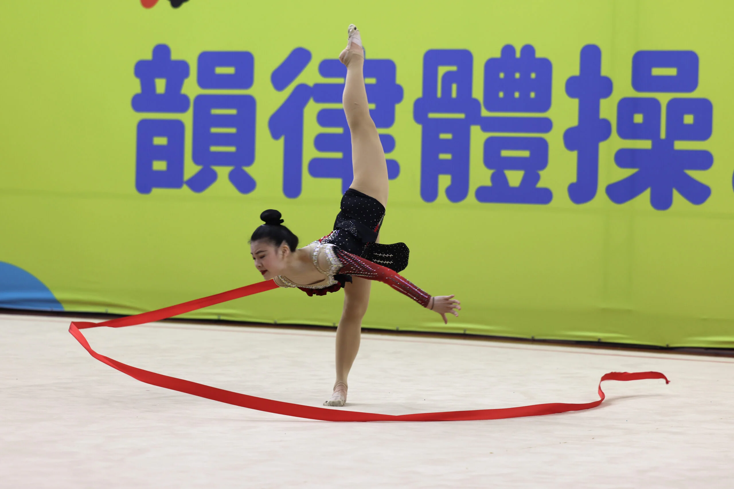 臺南全中運韻律體操競賽,今天進行「成隊決賽暨個人全能資格賽」第二天賽事,臺中市東山高中繼國女組在上午奪得金牌後,於下午高女組以總分227.217勝過勁敵桃園市龍潭高中封后,達到一日雙金的成就。