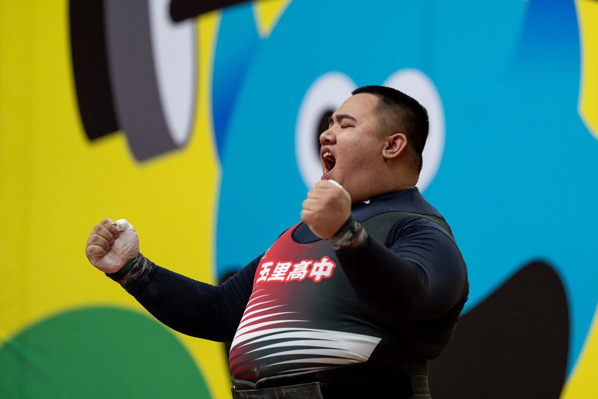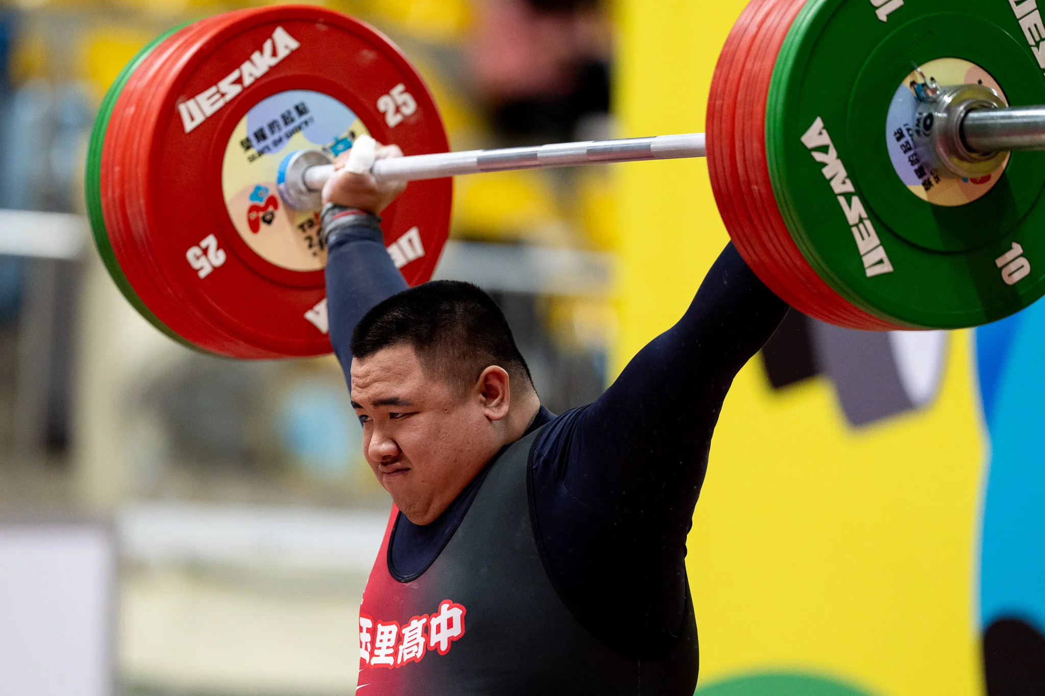 來自花蓮縣玉里高中的柯冠廷,去年在109+公斤量級以挺舉、總和雙破大會紀錄取金。今年全中運抓舉先是以145公斤抓出破紀錄成績,挺舉更驚艷全場,第二把191成功已完成三破大會紀錄的成績。第三把更加重至200公斤,突破再突破,終場以抓舉145公斤、挺舉200公斤,總和345公斤力壓群雄,三破大會紀錄快意摘金。