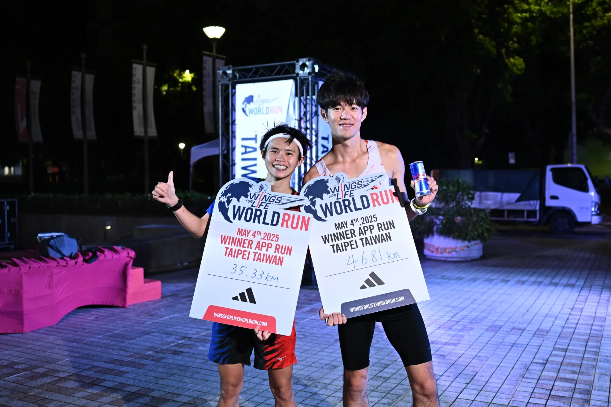 Wings for Life 全球路跑與運動品牌 adidas合作,台北站也結合 adidas Runners Taipei 跑步社群號召跑友參與,其中更有專業的配速員協助跑者擺脫虛擬終結者號的追逐,響應活動理念,為不能跑的人而跑。今年全球跑者和輪椅使用者,平均每人完成12.4公里,累積總距離相當於繞地球赤道近64圈,其中日本選手 Jo Fukuda 以71.67公里的成績創下賽事最遠距離紀錄,並拿下男子組冠軍,這也是他個人第三座全球冠軍;德國選手 Esther Pfeiffer 則以59.03公里贏得女子組冠軍,不只拿下德國第一位女性全球冠軍,也成為史上第二位突破59公里的女性。