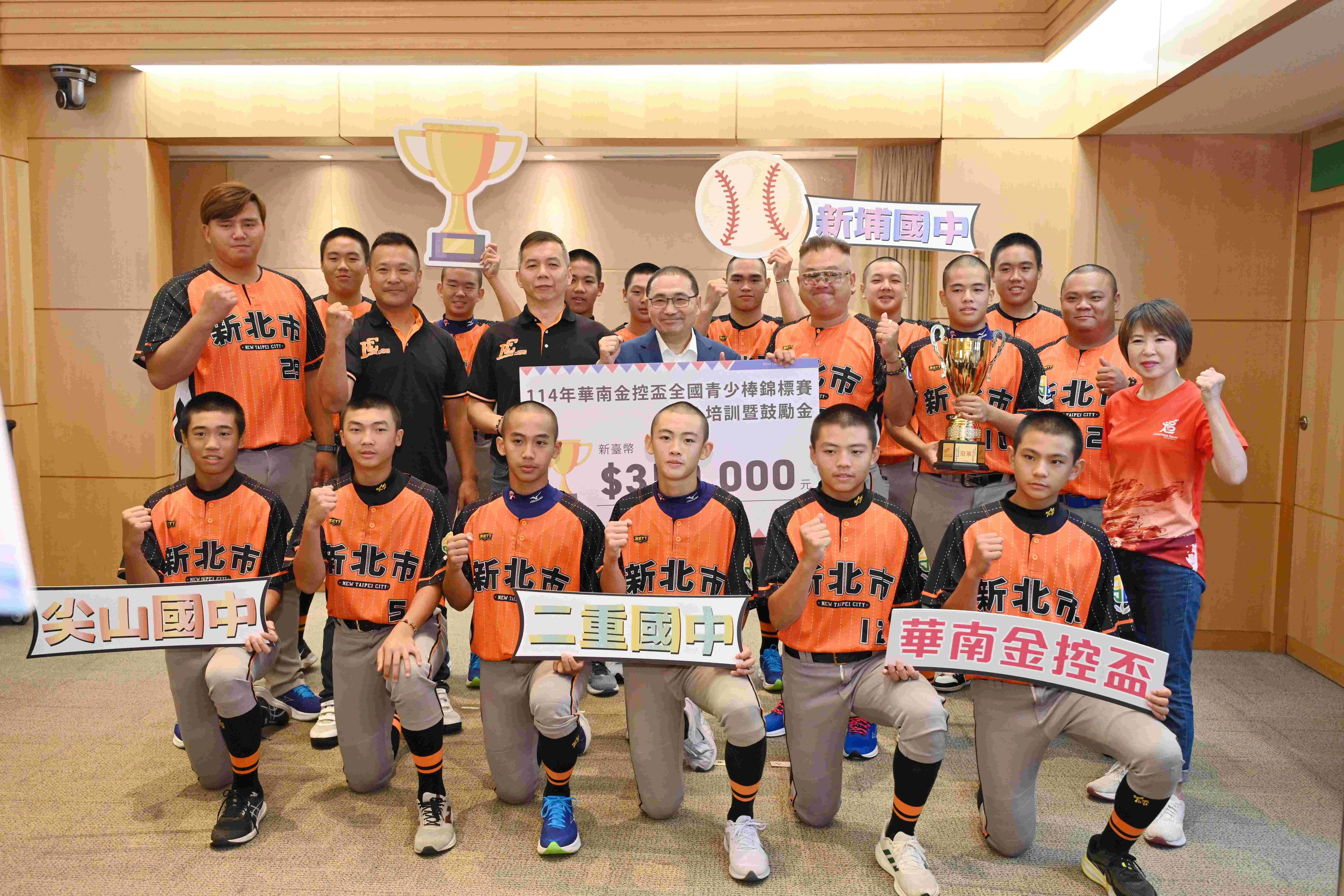 「114年華南金控盃全國青少棒錦標賽」新北市代表隊氣勢如虹、榮耀奪冠!今(16)日上午,來自二重、新埔、新泰及尖山等四所國中的選手與教練團出席市政會議,攜手將冠軍獎盃獻給市民,與大家分享這份屬於新北的光榮時刻。市府頒發35萬元培訓金,肯定選手們的傑出表現,並為即將出征國際賽事注入強心針。新北代表隊將於8月17日至23日代表臺灣,前往臺南參加「2025年第12屆亞洲(U15)青少棒錦標賽」,力拚再創高峰!