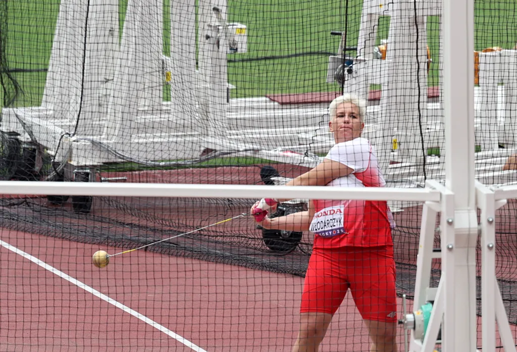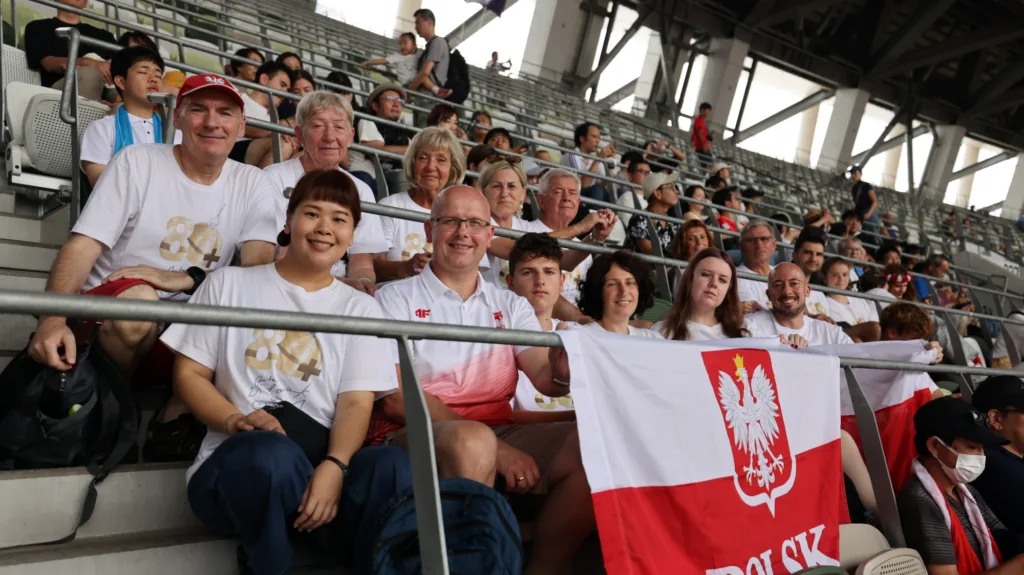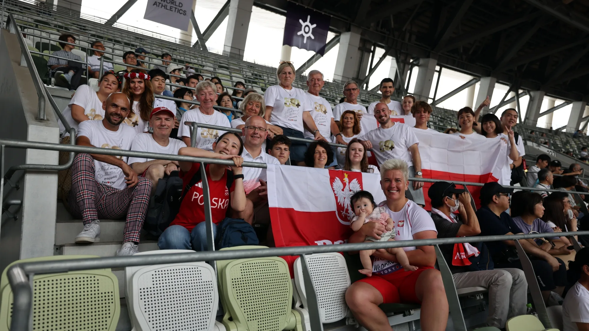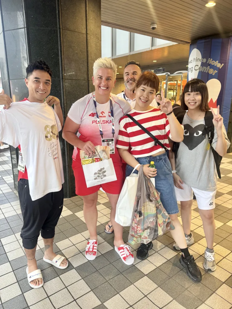 波蘭鏈球女王沃達奇克(Anita Włodarczyk),在東京世界田徑錦標賽資格賽順利晉級後,特別到國立競技場三樓觀眾看台區,感謝穿著白色特製T恤的應援團,親切的她感激每位到場親友,而其中一位來自台灣的林雅鴻,沃達奇克珍惜兩人因田徑結緣。
