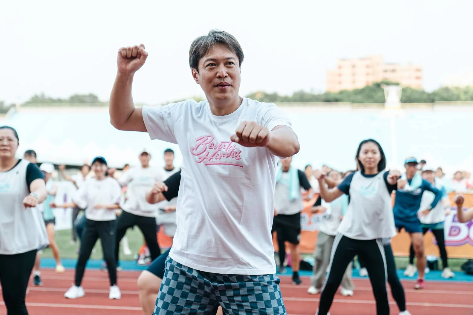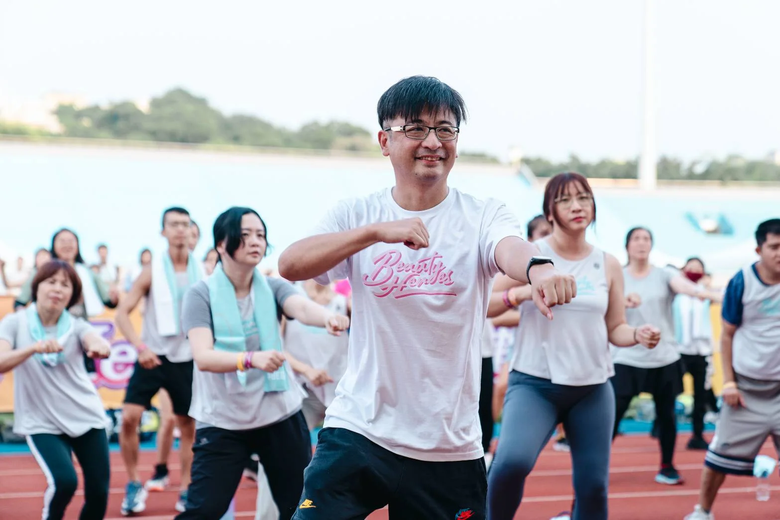在今天的活動中,謝典林也展現平常練習皮拉提斯及瑜伽等運動的成果,熱情滿滿地投入在派對中,他更期待,每年能有越來越多人一起響應,塞滿體育場,將活動變成大型的運動派對,甚至是嘉年華。