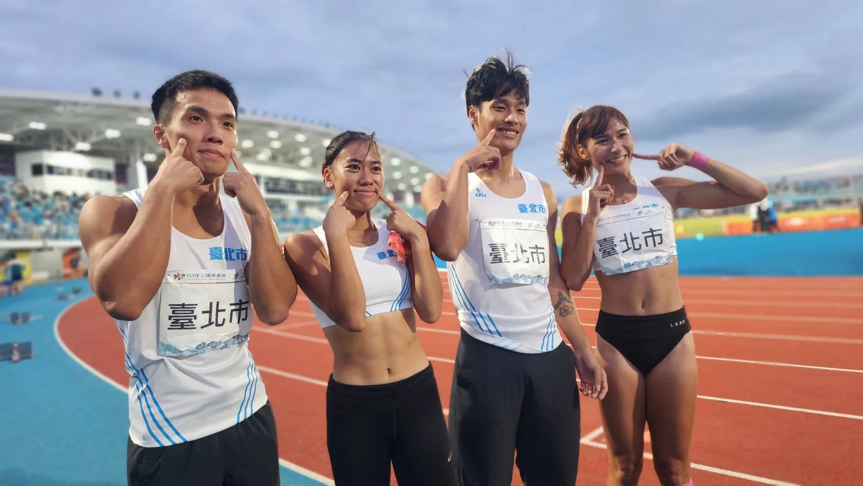 集結本屆全運會男、女400公尺金牌,臺北市隊葛吳諺明、柳辰諭、王喬弘跟廖晏均,在田徑混合4X400公尺接力決賽,跑出3分24秒03破全國。(原紀錄3分25秒73,林昭丞、廖紫涵、陳傑和陳羿岑,2023台南全運會)