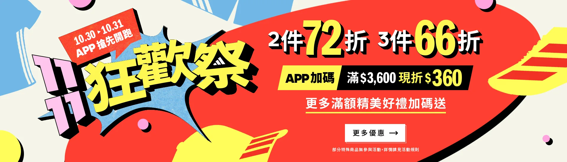 11月1日至11月12日於adidas官網及APP購買2件商品即享72折、3件則享66折,使用APP結帳單筆消費滿3,600元現折360元,還能同步累加滿額贈優惠,多款話題熱銷品加入優惠行列,無論運動或日常穿搭都值得購入!