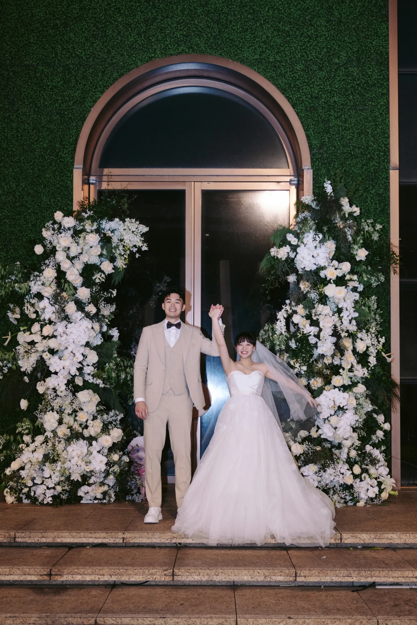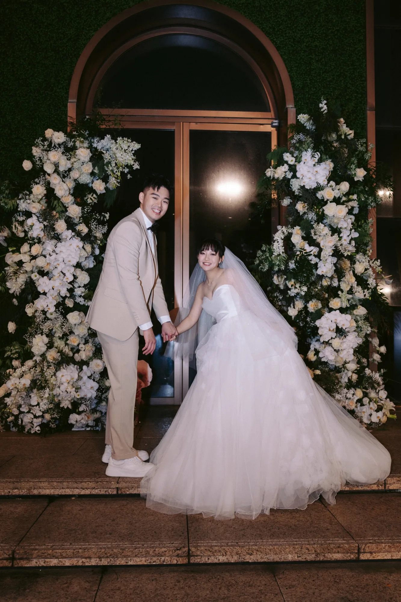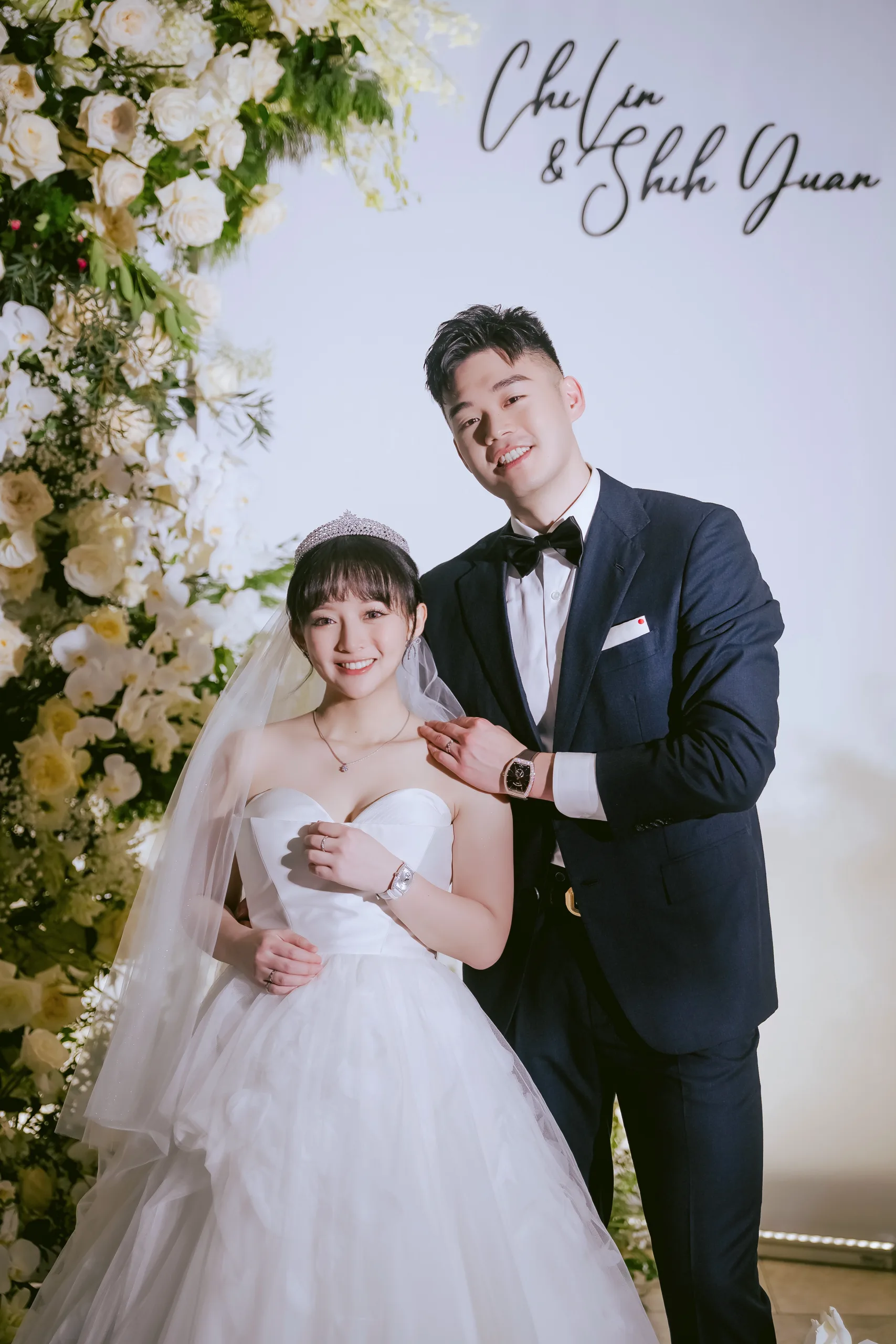 新人進場時鎂光燈閃個不停,新娘陳詩媛身穿2025婚紗女王Vera Wang Bridal系列的白紗-Aleu,採用不同心型領口設計與獨特的剪裁,使整體具立體視覺效果和時尚氣息,立體紗藏入在一層一層的薄紗中,更優雅且隆重。腕間則選擇瑞士高級獨立製錶品牌 Franck Muller 的 Cintrée Curvex Majestic 12,品牌標誌性的酒桶型錶殼展現優雅而不張揚的存在感,搭配太陽放射紋雕刻與鑽石錶圈,在光影流轉間流露低調奢華的層次,為整體造型添上一抹雋永而從容的精緻氣息。新郎王齊麟則身著被譽為「西裝之王、男裝界法拉利」的義大利頂級品牌 Kiton 全訂製西裝,以 14 微米 Cashmere 混紡面料與 27 道純手工工法打造,稀有而精緻的質感,襯托出奧運雙金得主從容自信的氣場。腕間搭配 Franck Muller Vanguard Sfumato Slim,棕色煙燻錶盤在光影流轉間展現深邃層次,為整體造型注入低調而成熟的藝術氣息,恰到好處地平衡力量與優雅。