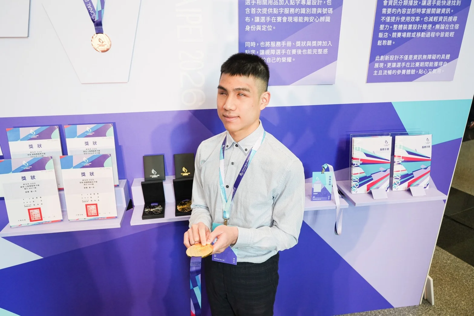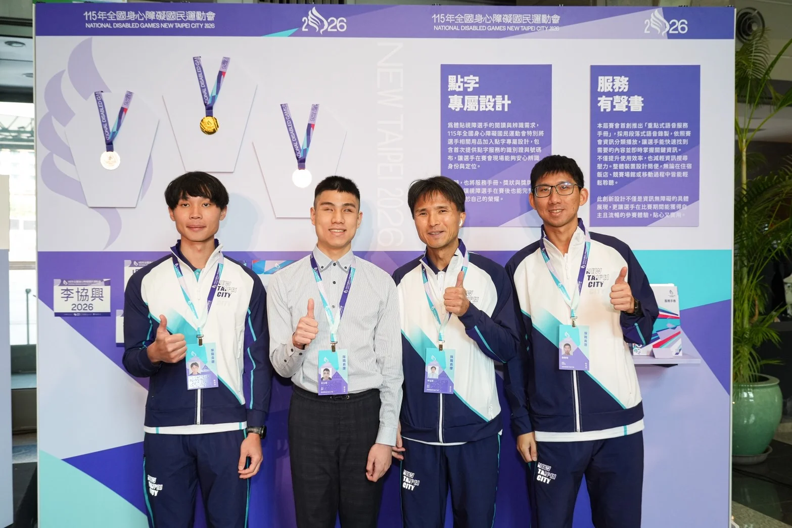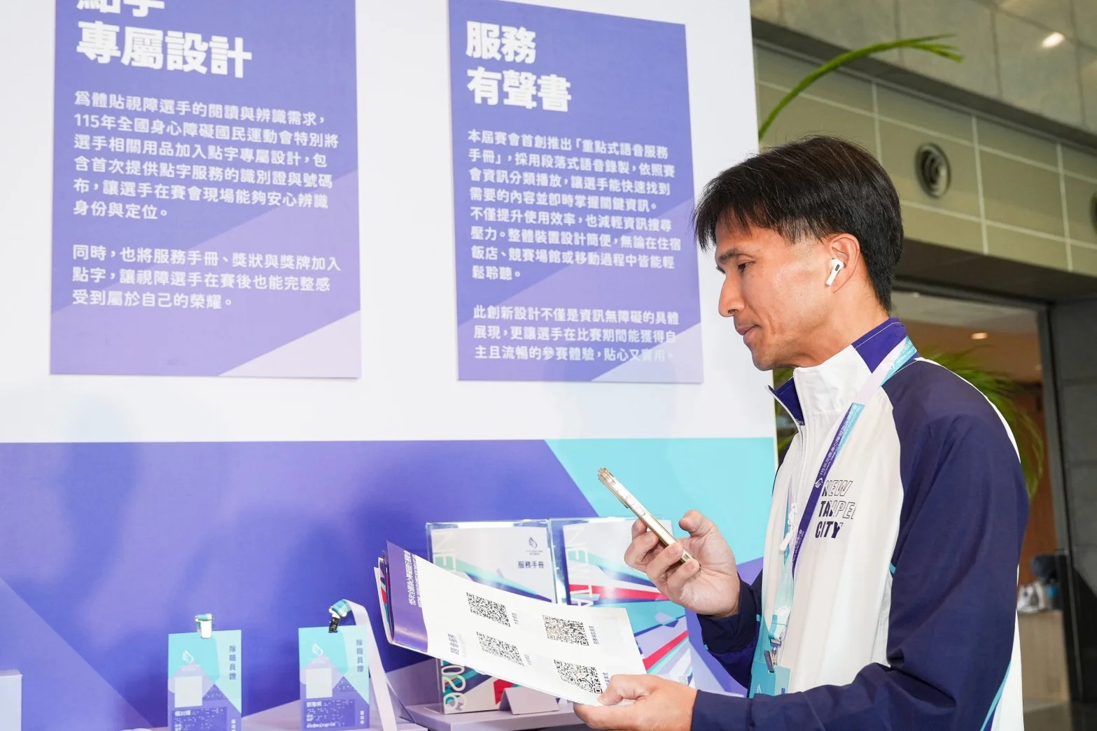 本屆賽會在無障礙設計上再進一層,推出多項創新服務,包括全新導入的「點字專屬設計」製作多項點字用品,除服務手冊、獎狀與獎牌外,識別證與號碼布更是首次提供客製化點字設計,讓視障選手能安心辨識、感受平等尊重;另一亮點則是「服務手冊有聲書」首創段落式重點語音播放,內容分類明確、操作簡單,資訊即時掌握,成為比賽期間的重要資訊輔具。透過貼心的細節,實踐「資訊無障礙」與「參賽零距離」的核心理念。除了在選手用品設計展現貼心,另一項重點則展現在大會服裝材質,強調「人本設計」,兼具機能性與舒適性,以確保能提供所有大會工作人員最佳活動自由度與穿著感受。