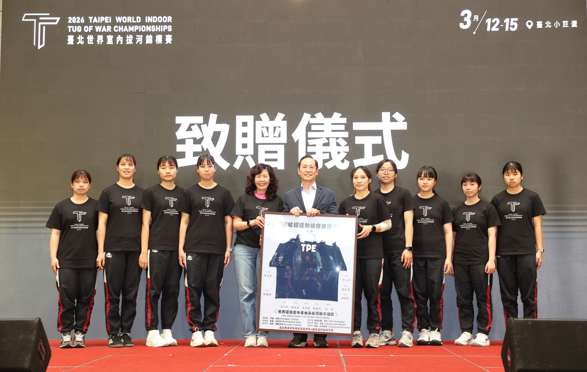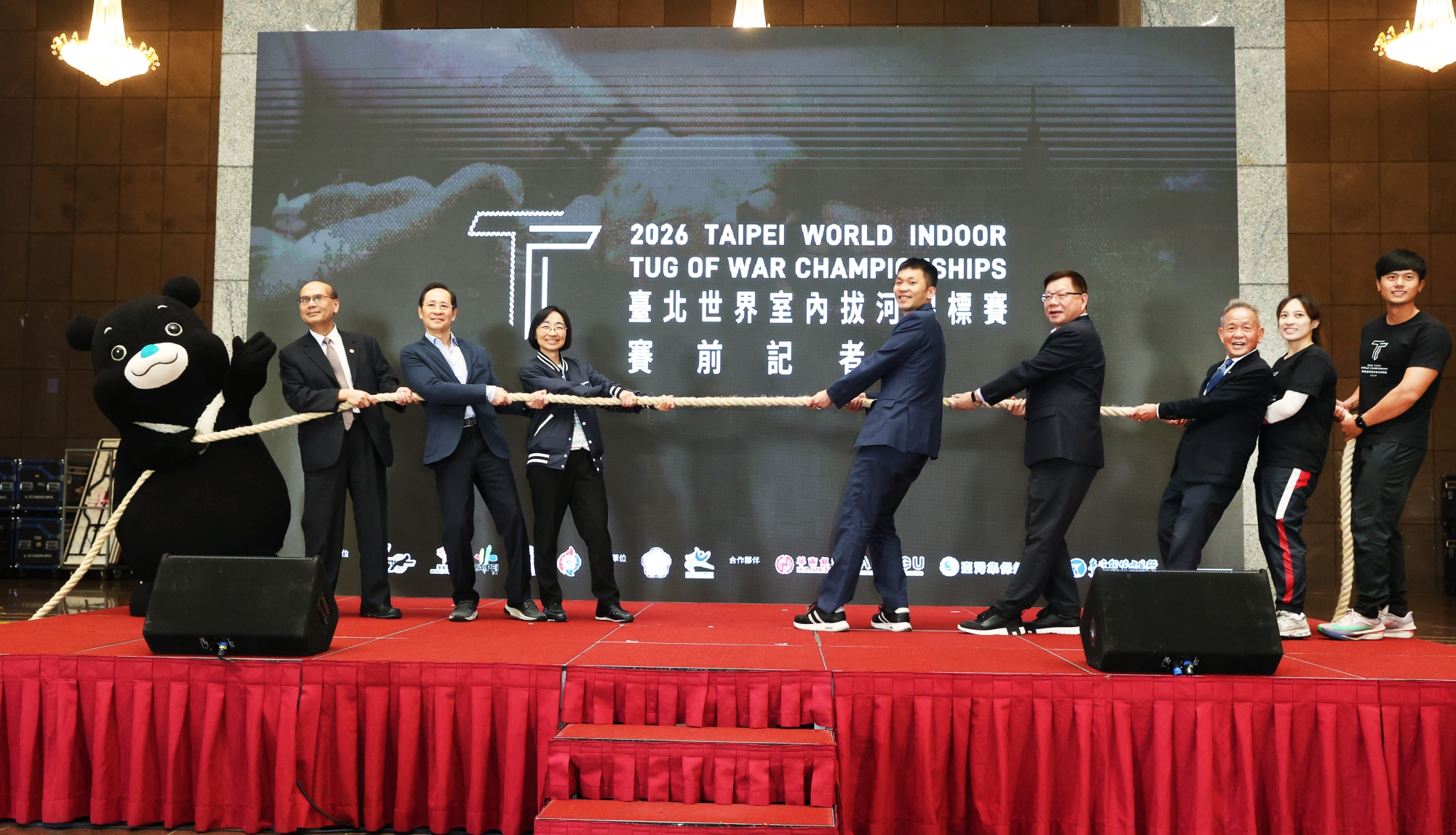 啟動儀式震撼全場 誓言將榮耀留在臺灣 今日的記者會由景美女中樂儀隊以氣勢磅礡的樂隊表演揭開序幕。在全場倒數聲中,李洋部長、游竹萍局長與陳建平理事長同步觸碰大型 LED 螢幕上的數位繩結,瞬間啟動炫目的 LOGO 動畫,傳達「一條繩,拉近全世界」的核心精神。活動尾聲,貴賓們與國家代表隊選手、吉祥物「熊讚」一同擺出經典的「拔河後拉」戰姿,誓言發揮主場優勢。